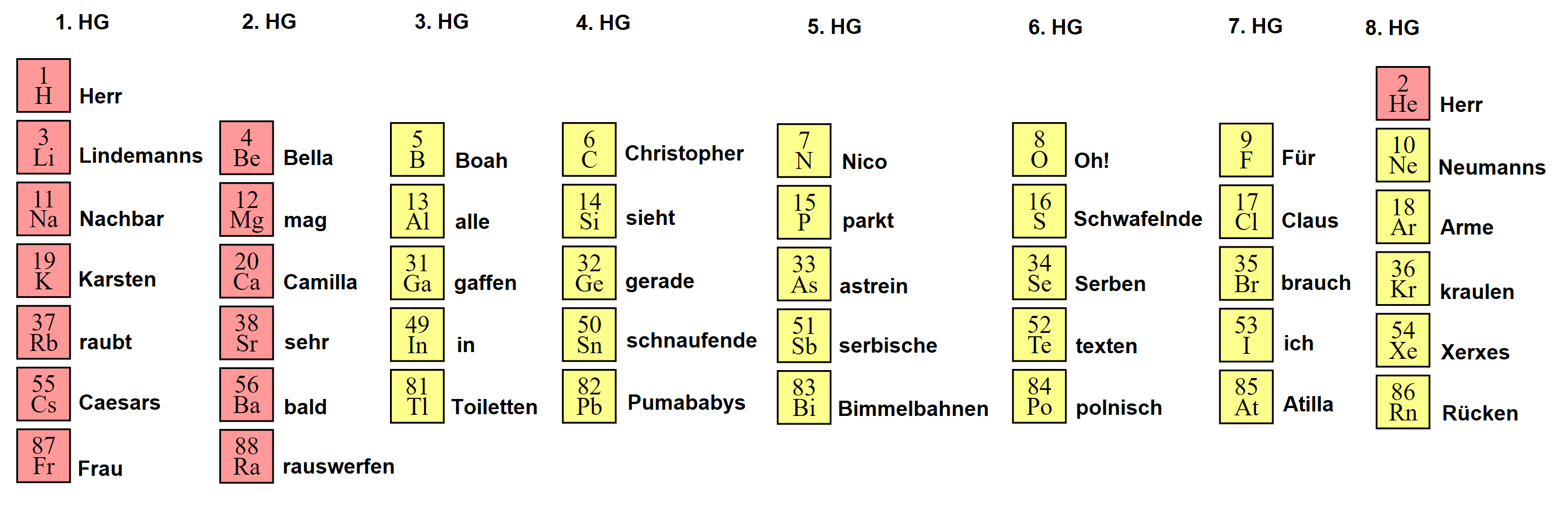 Credits Merksprüche PSE Grafik: User:Double sharp, modified based on File:Simple Periodic Table Chart-en.svg by User:Offnfopt, Simple Periodic Table Chart-blocks, CC BY-SA 4.0↩︎