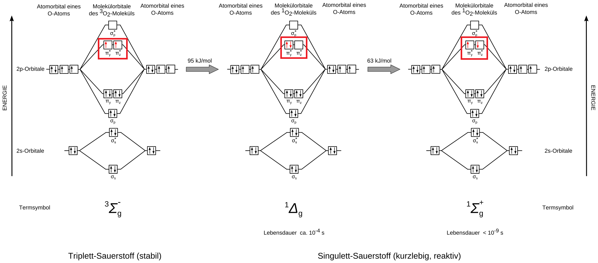Der Unterschied zwischen Triplett- und Singulett-Sauerstoff ist gut in diesem Molekülorbitaldiagramm dargestellt: