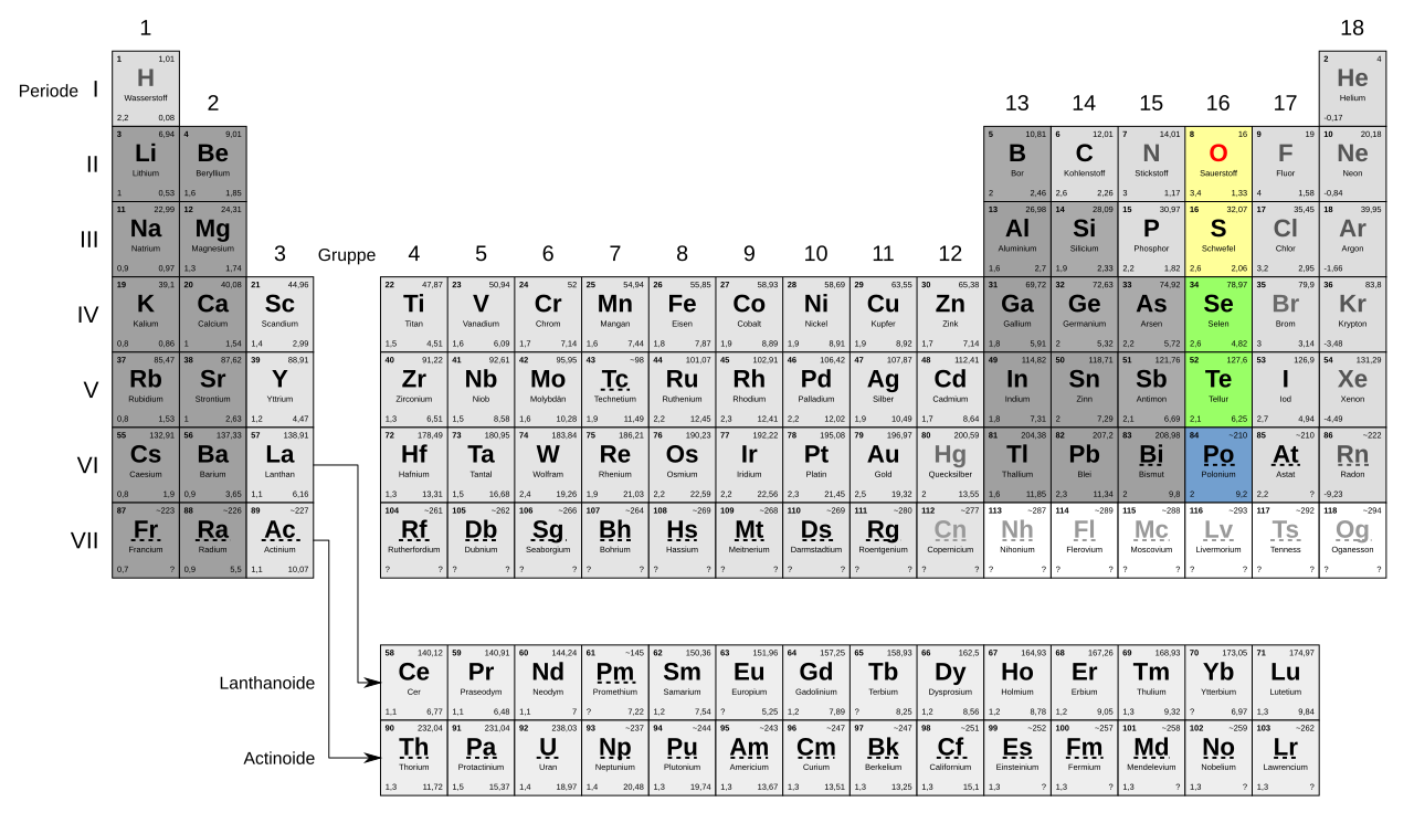 Credits Stellung der Chalkogene im PSE Grafik: Mrmw, Periodensystem newdraft, bearbeitet von MK, CC0 1.0↩︎