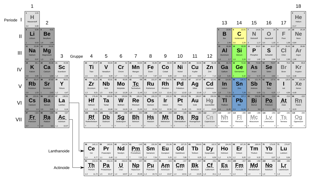 Credits Stellung der Kohlenstoffgruppe im PSE Grafik: Mrmw, Periodensystem newdraft, bearbeitet von MK, CC0 1.0↩︎