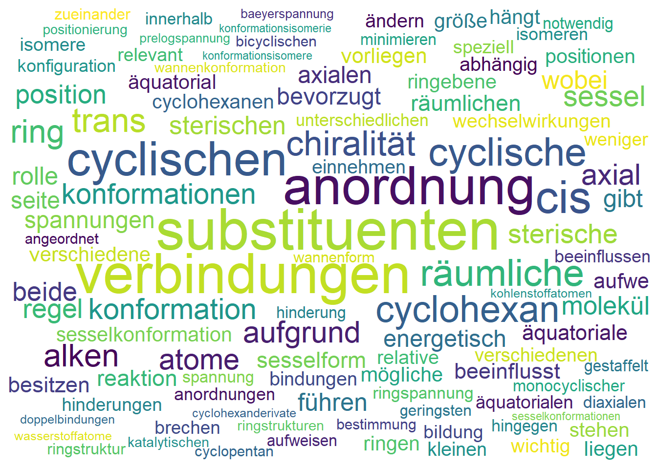 Das IMPP fragt besonders gerne nach den Details der Sesselkonformation, der Unterscheidung zwischen axialen und äquatorialen Positionen sowie der Auswirkung von Substituenten auf die Ringstabilität.