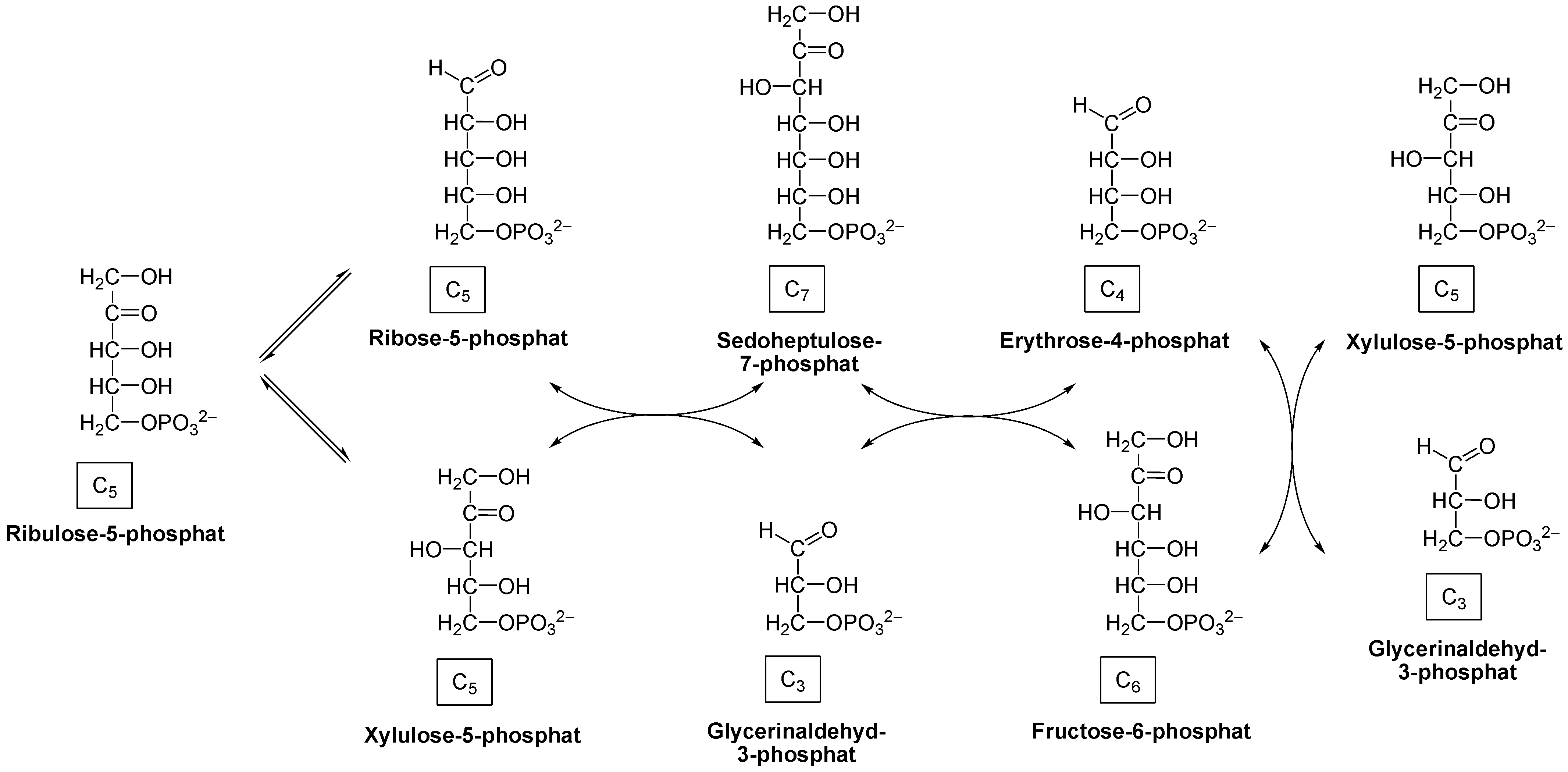 Diese Reaktionen sind besonders wichtig, weil sie die Umwandlung von Pentosen (5-Kohlenstoff-Zucker) in Hexosen (6-Kohlenstoff-Zucker) und umgekehrt erlauben. Somit können Zellen je nach Bedarf auf unterschiedliche Zuckerphosphat-Pools zurückgreifen.