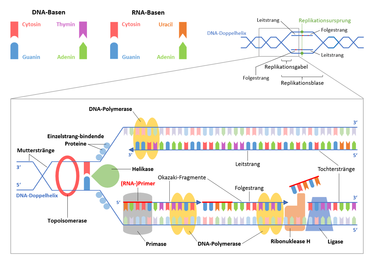 Auf die Schlüsselenzyme gehen wir auch im nächsten Abschnitt genauer ein, da sie die zentralen Akteure bei der DNA-Replikation sind. Hier eine kurze Übersicht: