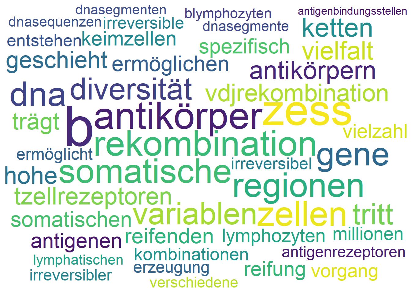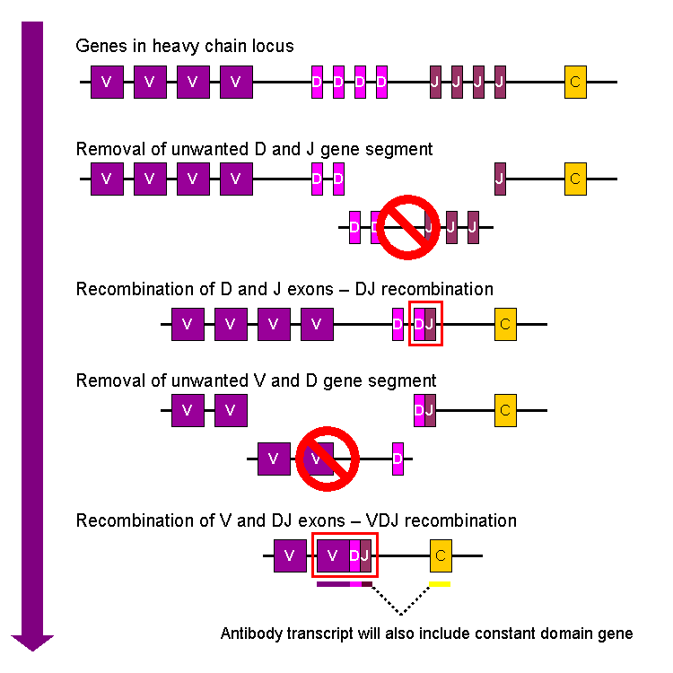 Stellen wir uns vor, eine B-Zelle im Knochenmark wählt zufällig ein V-, ein D- und ein J-Segment für die schwere Kette eines Antikörpers. Diese Segmente werden herausgeschnitten, zufällige Nukleotide durch TdT hinzugefügt und alle zusammengefügt. Das Resultat ist ein spezifischer Teil des Antikörpers, der eine einzigartige Antigenbindungsstelle hat, die es vorher in dieser Form nicht gab.