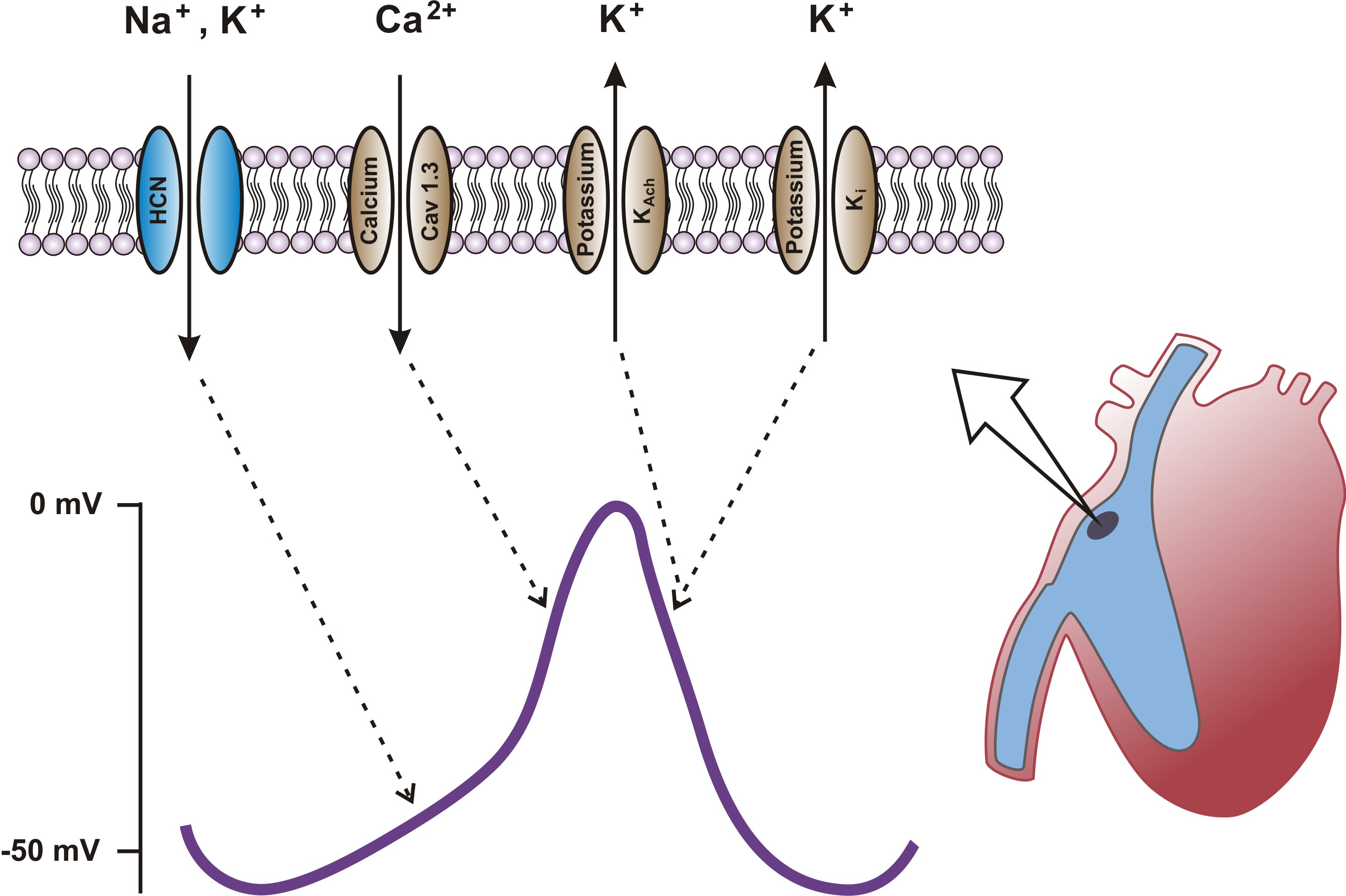 - Schrittmacherzellen: Langsame Depolarisation durch HCN-Kanäle, bekannt als ‘funny current’.