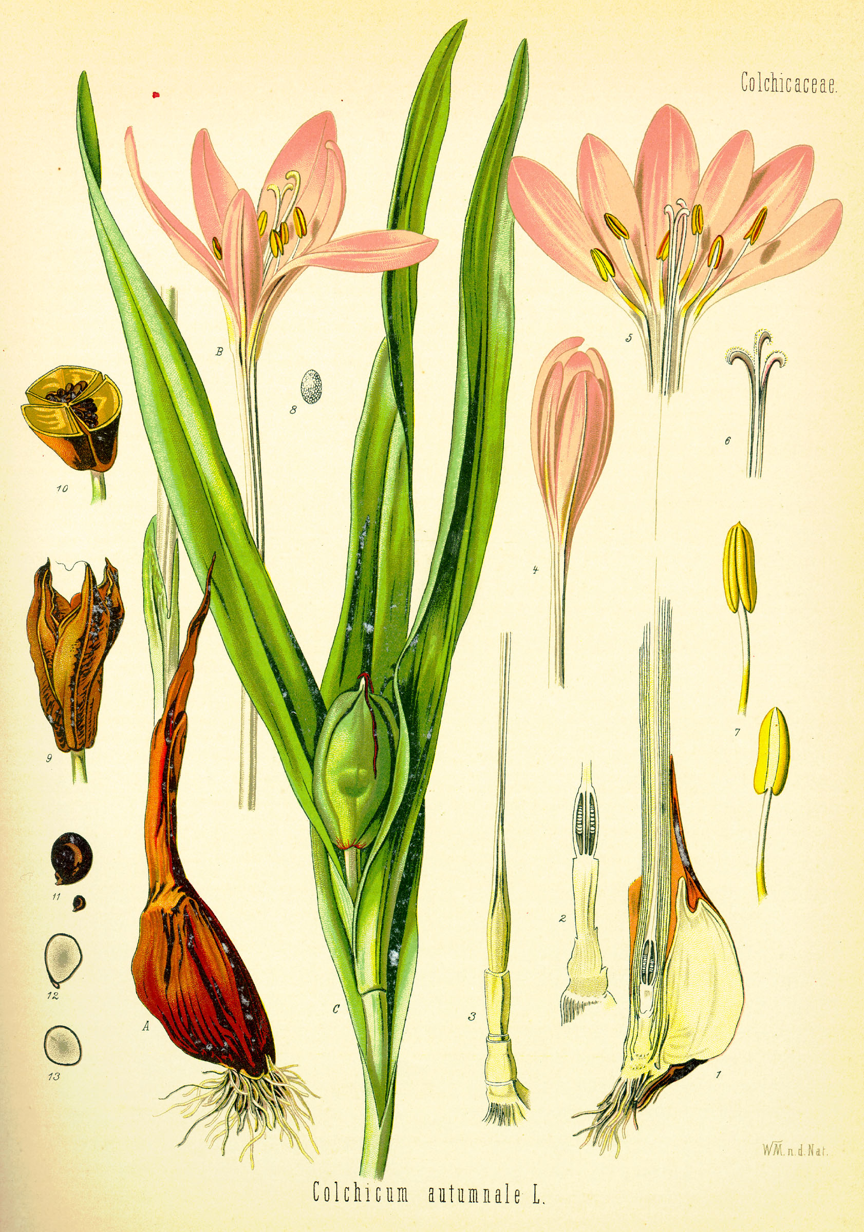 Credits Illustration eines Vertreters (Herbstzeitlose) der Pflanzenfamilie Colchicaceae. Grafik: Franz Eugen Köhler, Köhlers Medizinal-Pflanzen, als gemeinfrei gekennzeichnet, Details auf Wikimedia Commons↩︎