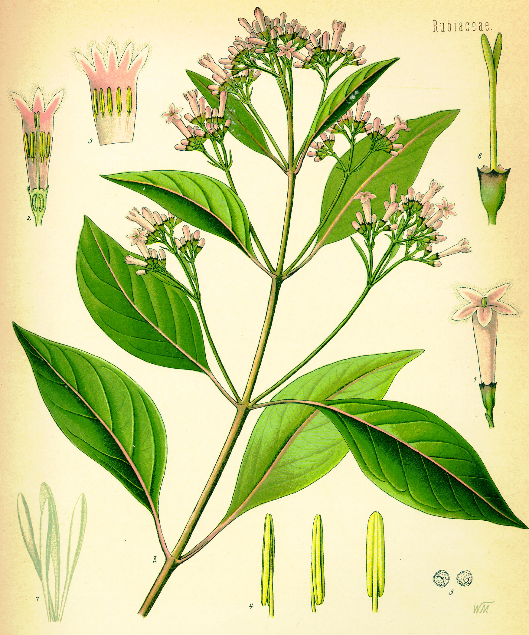 Credits Illustration eines Vertreters (Cinchona officinalis) der Pflanzenfamilie Rubiaceae. Grafik: Franz Eugen Köhler, Köhlers Medizinal-Pflanzen, als gemeinfrei gekennzeichnet, Details auf Wikimedia Commons↩︎