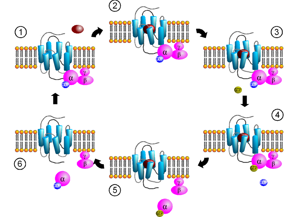 Credits Aktivierungszyklus von G-Proteinen durch G-Protein-gekoppelte Rezeptoren: (1) Bindung des G-Proteins; (2) Ligandenbindung; (3) Aktivierung des Rezeptors; (4) Aktivierung des G-Proteins; (5) Dissoziation des G-Proteins und Signaltransduktion; (6) Inaktivierung des G-Proteins Grafik: Sven Jähnichen, GPCR-Zyklus, CC BY-SA 3.0↩︎