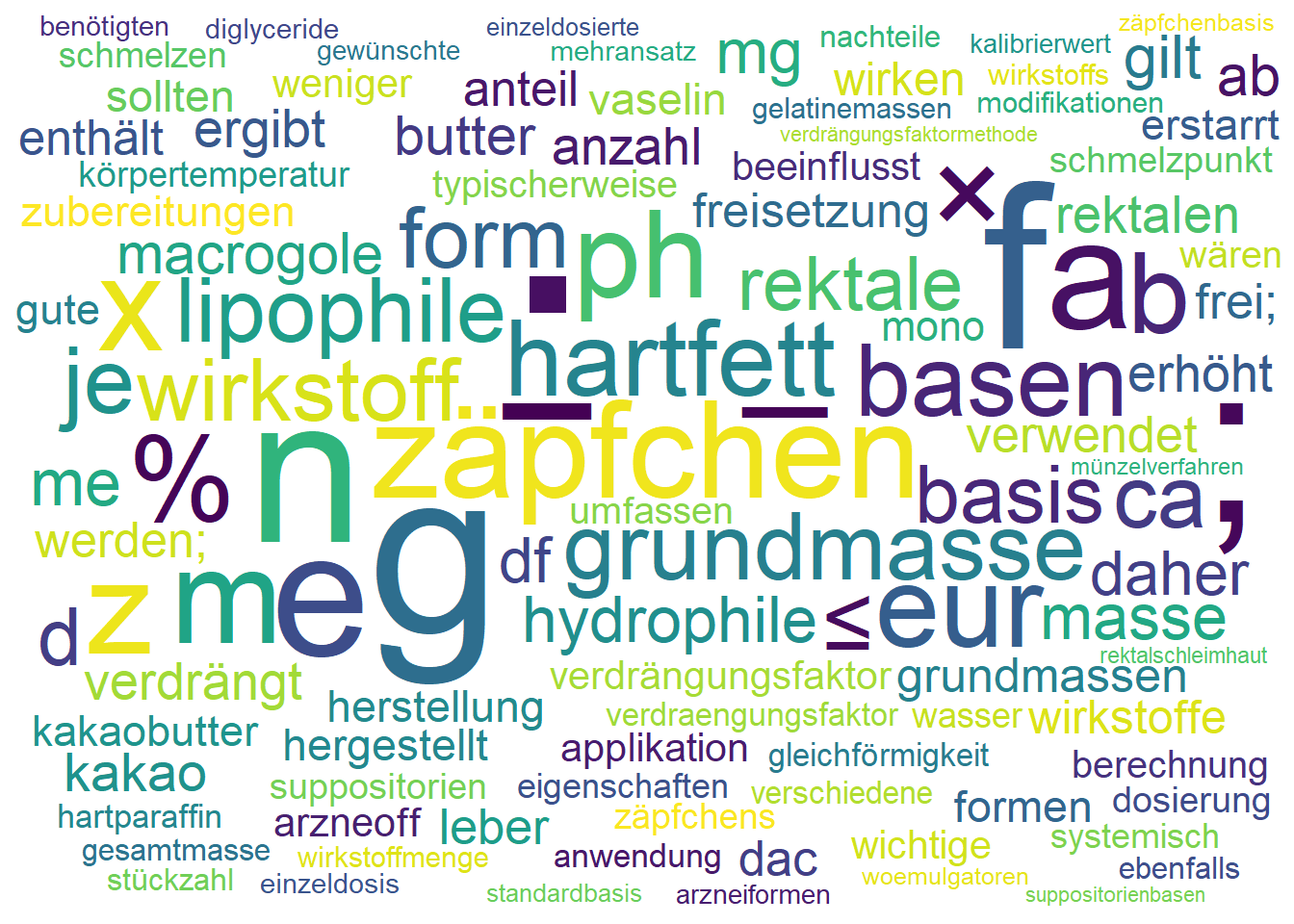 Beispiel-Formel: \[ M = n \cdot (E - f \cdot A) \] \(M\) = Gesamtmasse Grundmasse, \(n\) = Zahl der Zäpfchen (inkl. 10% Zuschlag), \(E\) = Eichwert eines Zäpfchens ohne Wirkstoff, \(f\) = Verdrängungsfaktor, \(A\) = Wirkstoffmasse pro Zäpfchen.