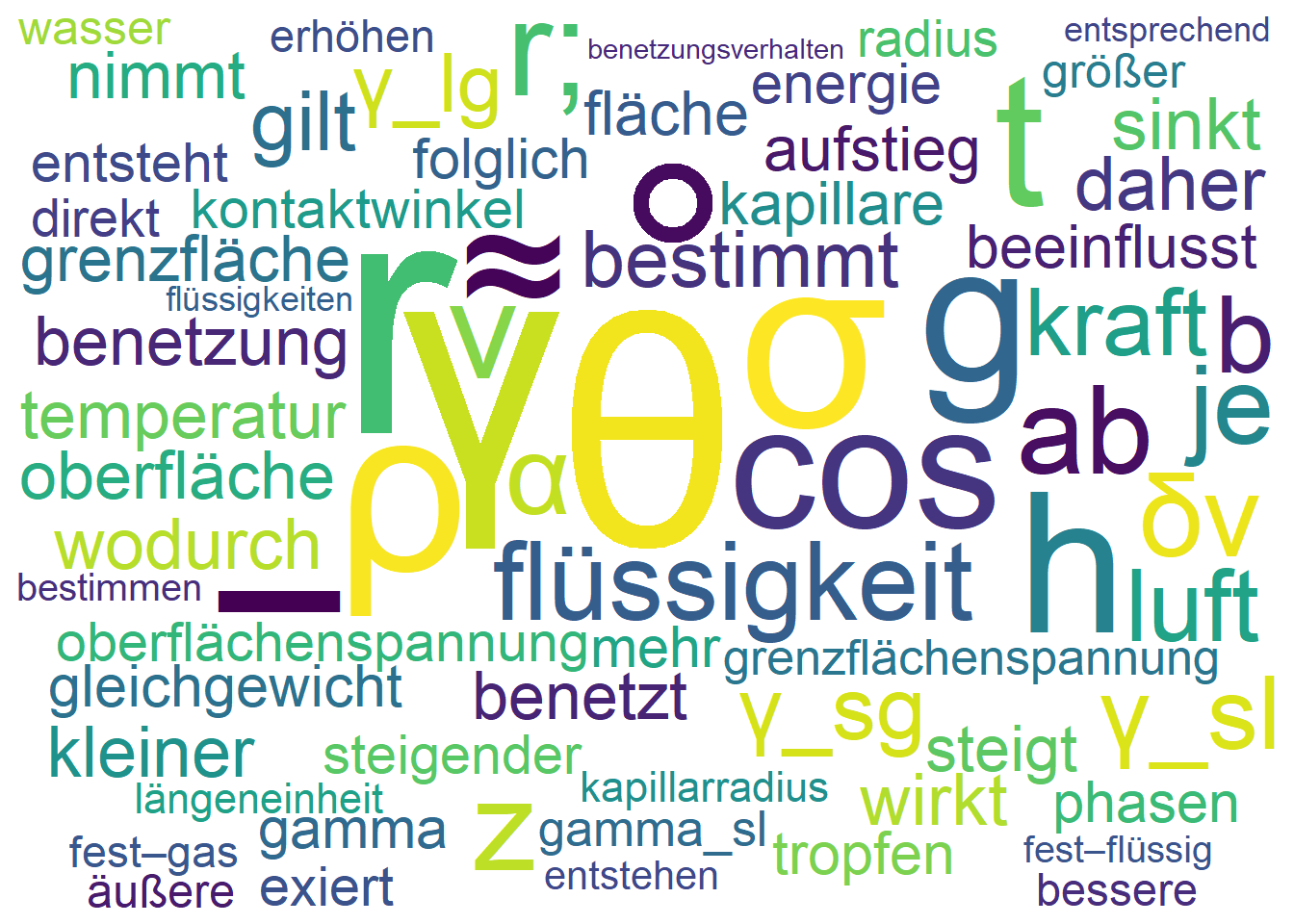 - Wie hoch das Wasser steigt, hängt von der Oberflächenspannung \(\gamma\), dem Kapillarradius \(r\) und dem Kontaktwinkel \(\theta\) ab (u.a. auch von Dichte und Schwerkraft).