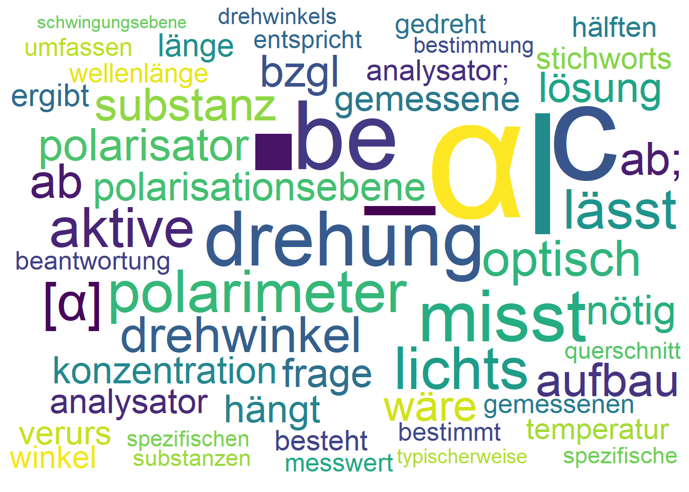 - \([\alpha]\) = spezifische Drehung (charakteristisch für jeden Stoff, hängt von Temperatur und Wellenlänge ab, Einheit oft: °·ml/(dm·g) oder °/(dm·g/ml))