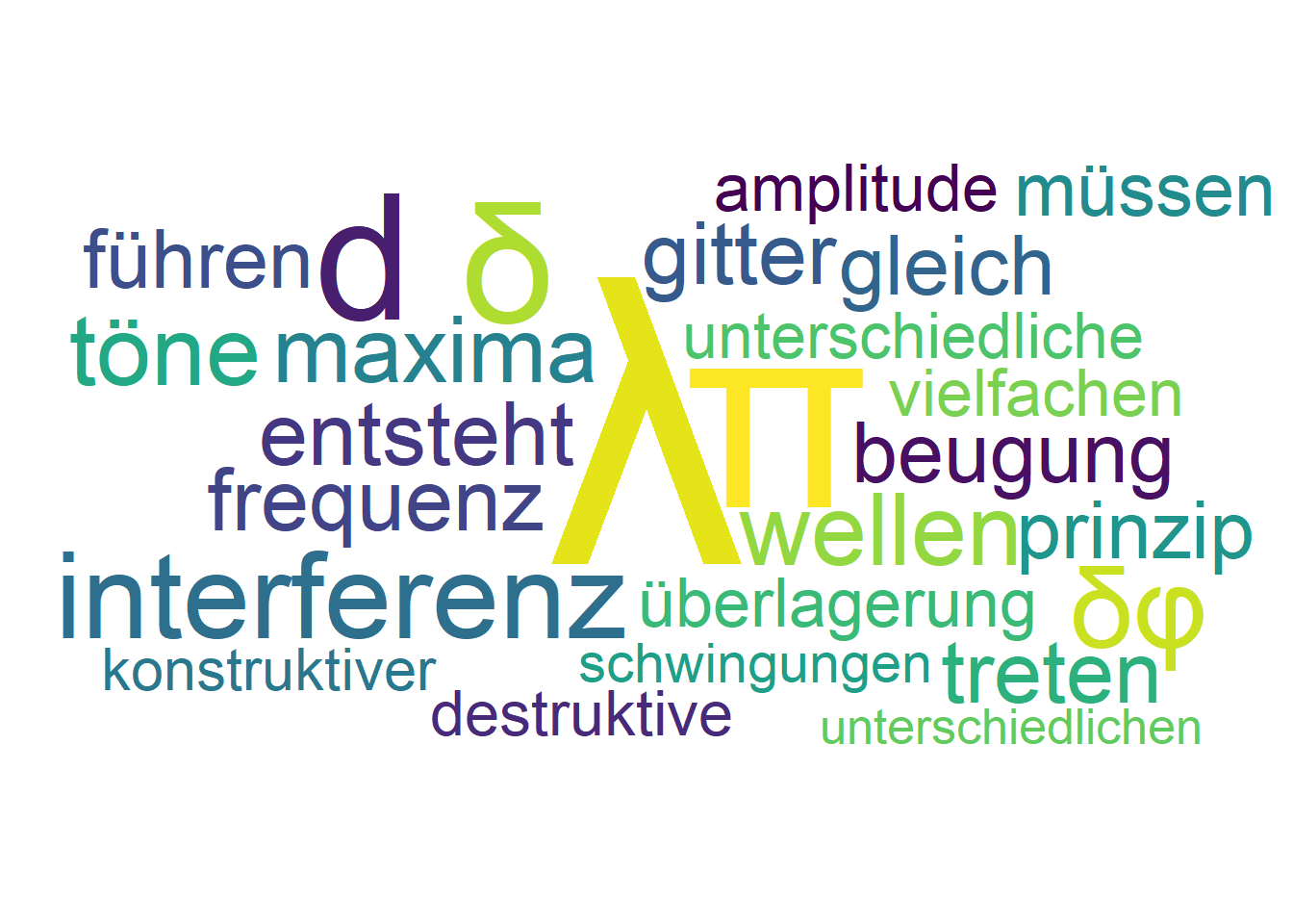 - Destruktiv: Treffen Wellenberge auf Wellentäler (falscher Gangunterschied, z.B. halbe Wellenlänge), löschen sie sich gegenseitig aus (dunkel).