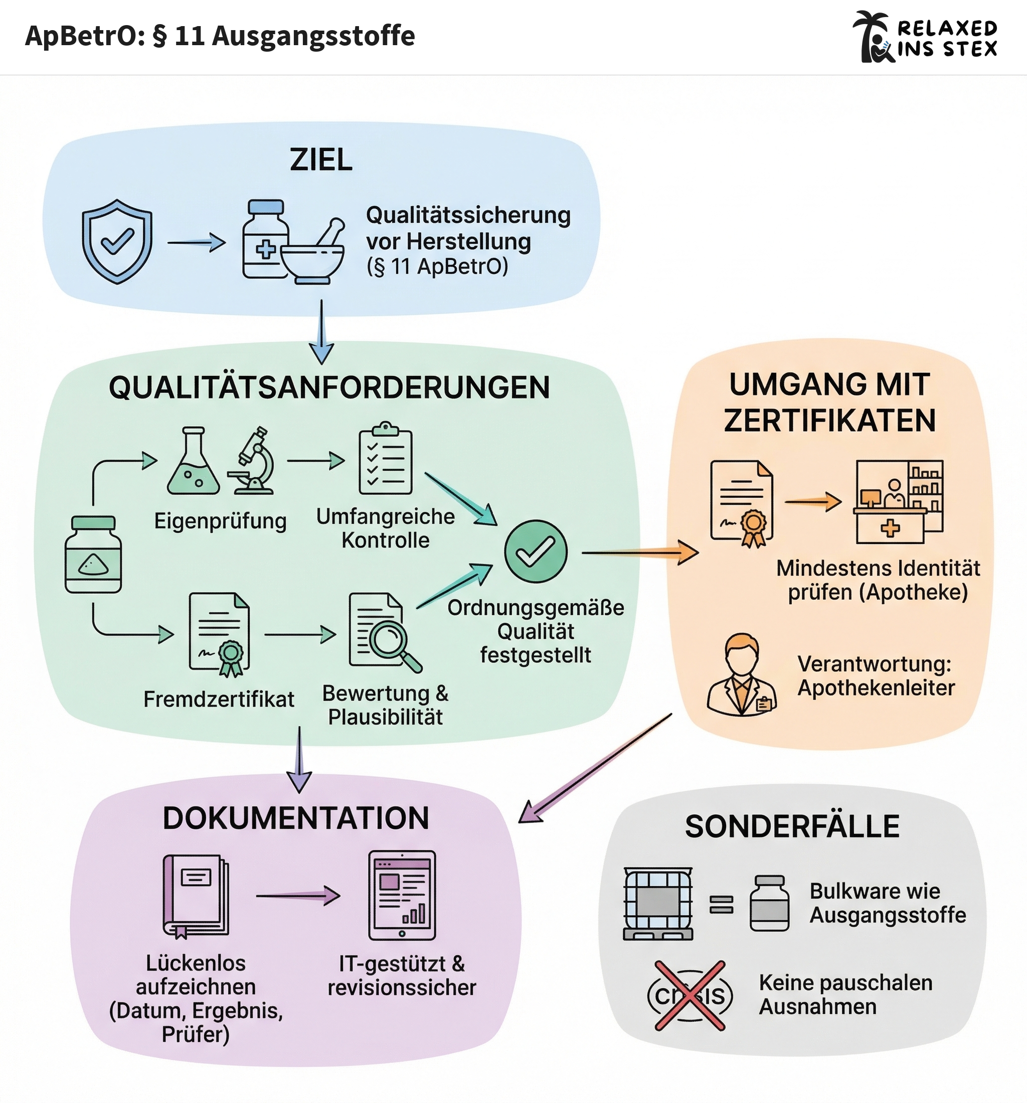 § 11 ApBetrO regelt, wie Apotheken die Qualität von Ausgangsstoffen sicherstellen müssen, bevor diese für die Arzneimittelherstellung verwendet werden dürfen. Im Mittelpunkt stehen die Prüfung, die nachvollziehbare Dokumentation und der methodische Umgang mit Prüfzertifikaten – ein zentrales Thema für die pharmazeutische Praxis und die 3. Staatsprüfung.