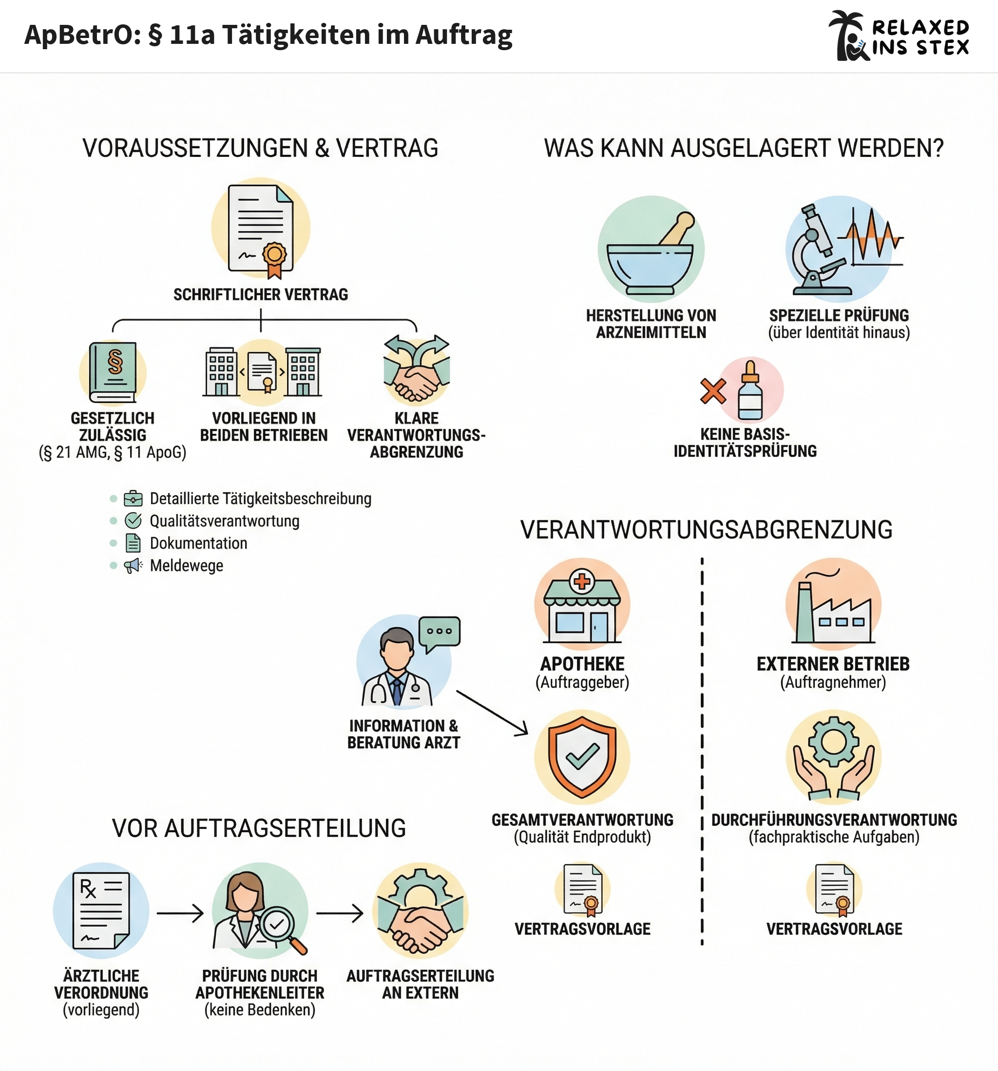 § 11a ApBetrO regelt, unter welchen Bedingungen eine Apotheke bestimmte pharmazeutische Arbeiten – besonders die Herstellung und Prüfung von Arzneimitteln – an einen externen Betrieb auslagern (outsourcen) darf. Der Paragraph stellt hierbei klare Anforderungen an Verträge und an die Verantwortungsabgrenzung zwischen den beteiligten Parteien, um die Arzneimittelsicherheit und die ordnungsgemäße Patientenversorgung zu gewährleisten.
