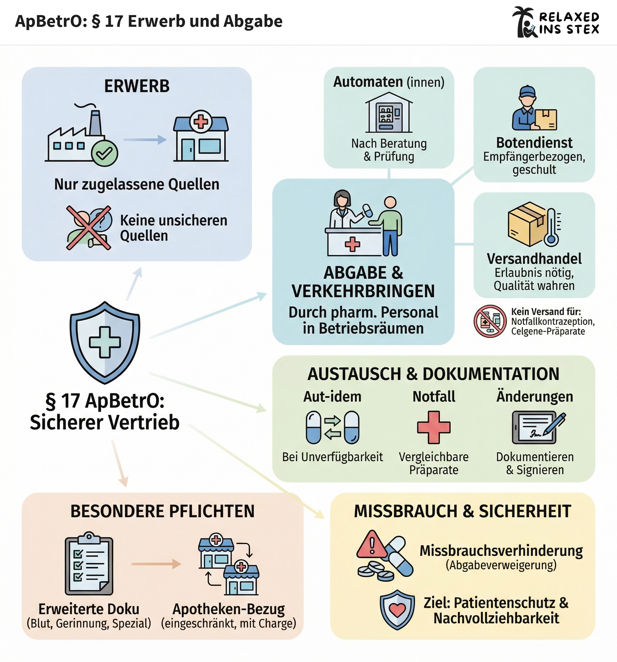 § 17 ApBetrO regelt umfassend und detailliert die rechtlichen Anforderungen an Erwerb, Abgabe, Dokumentation und den Vertrieb von Arzneimitteln in öffentlichen Apotheken. Der Paragraph stellt sicher, dass die Arzneimittelversorgung sicher, nachvollziehbar und ausschließlich durch berechtigte Personen und Betriebe erfolgt. Er betrifft damit zentrale Arbeitsbereiche im praktischen Apothekenbetrieb – von der Bestellung bis zur Übergabe an den Patienten, einschließlich Sonderfällen wie Versand und Botendienst.