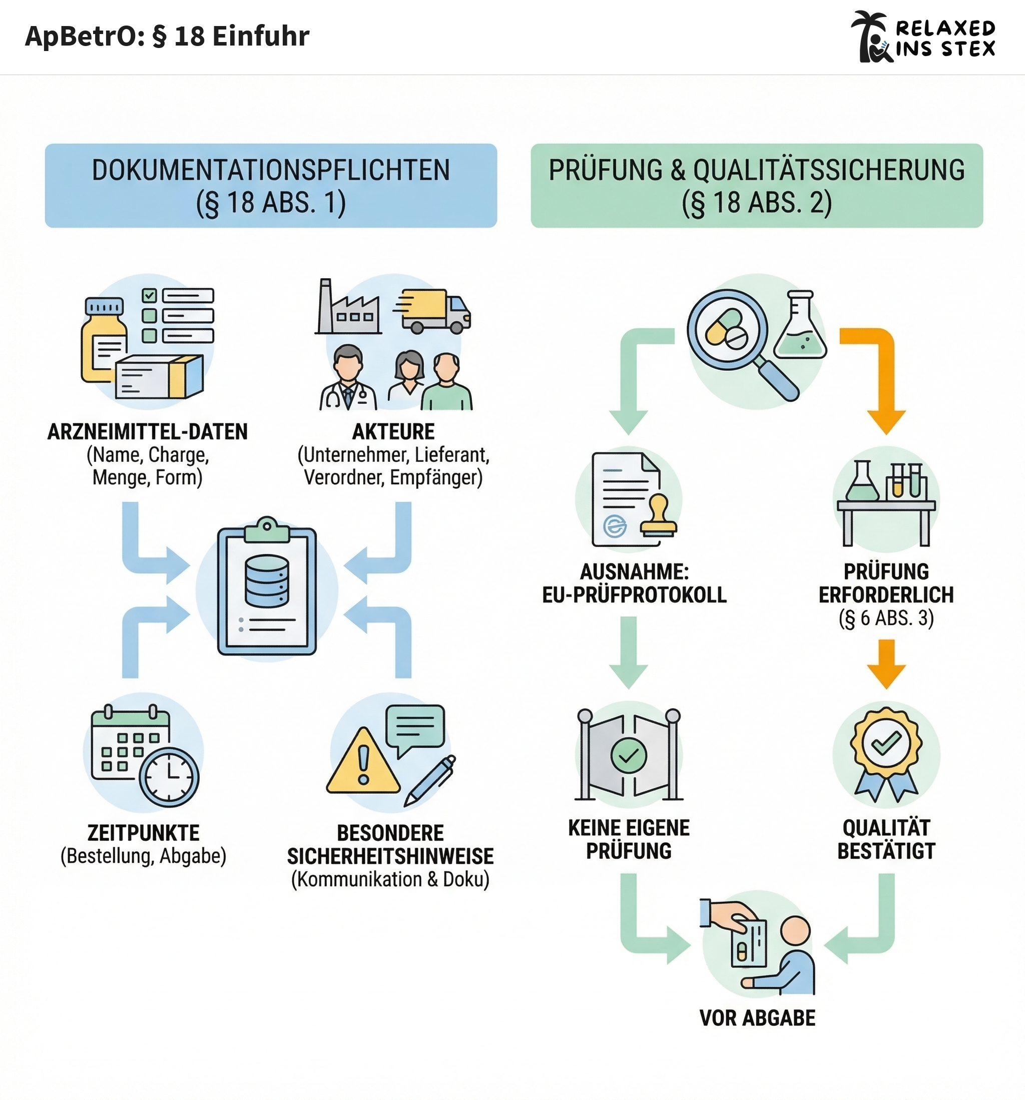 § 18 ApBetrO verpflichtet Apotheken, bei der Einfuhr von Fertigarzneimitteln nach § 73 AMG umfangreiche Angaben zur Rückverfolgbarkeit zu erfassen und bei besonderen Hinweisen darauf hinzuweisen und zu dokumentieren. Werden Arzneimittel (über die Ausnahmen hinaus) aus der EU eingeführt, ist eine Qualitätsprüfung vor der Abgabe Pflicht – sofern keine gleichwertige Prüfung in der EU bereits erfolgt ist.