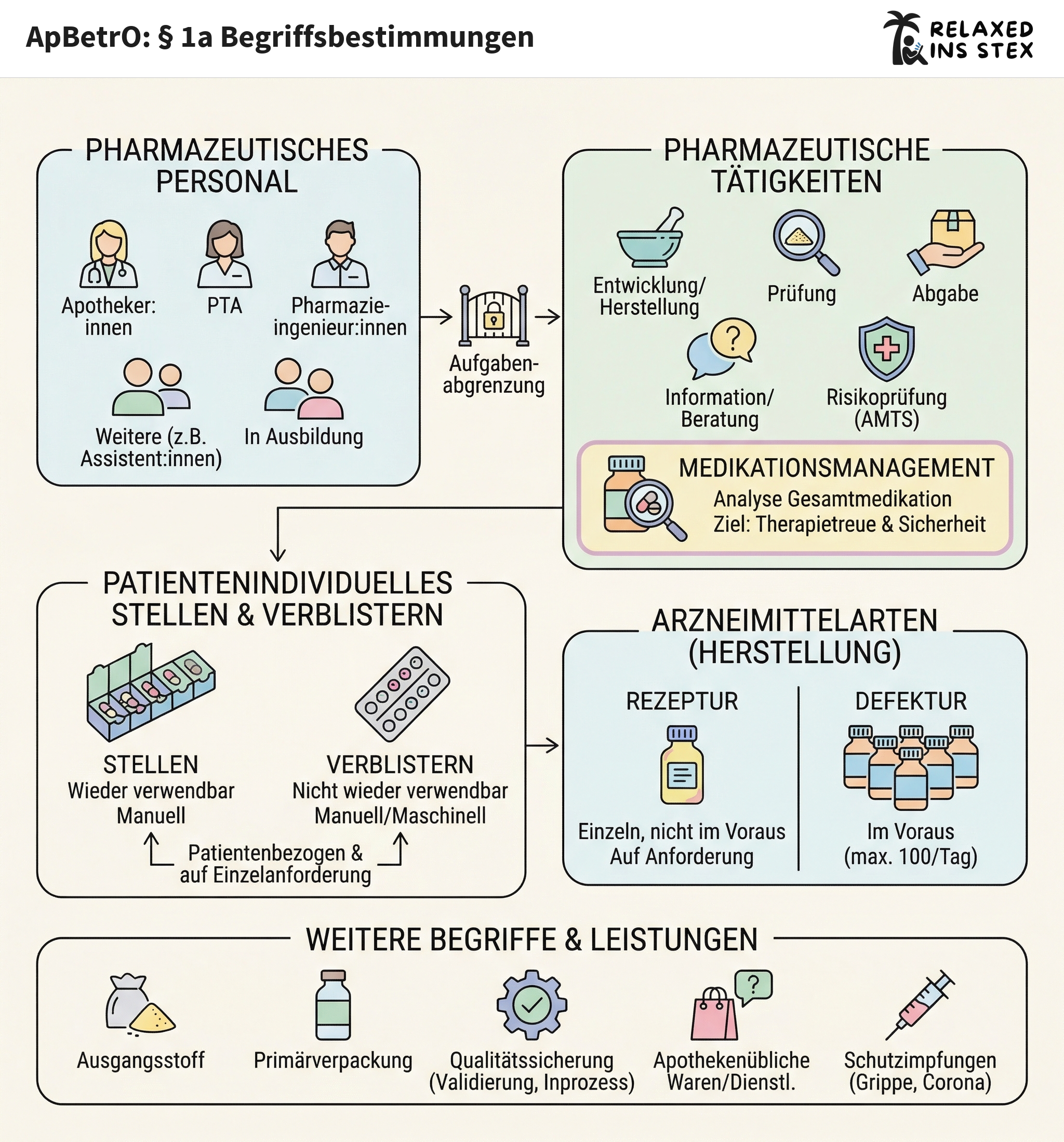 § 1a ApBetrO liefert essenzielle Begriffsbestimmungen für die Organisation und Praxis in der Apotheke. Für Studierende, Berufseinsteiger:innen und erfahrene Apotheker:innen ist das sichere Beherrschen dieser Definitionen Voraussetzung für eine korrekte und rechtssichere Berufsausübung. Die Definitionen beeinflussen unmittelbar die Prozesse, Verantwortungsbereiche und Prüfungssituationen im pharmazeutischen Alltag.