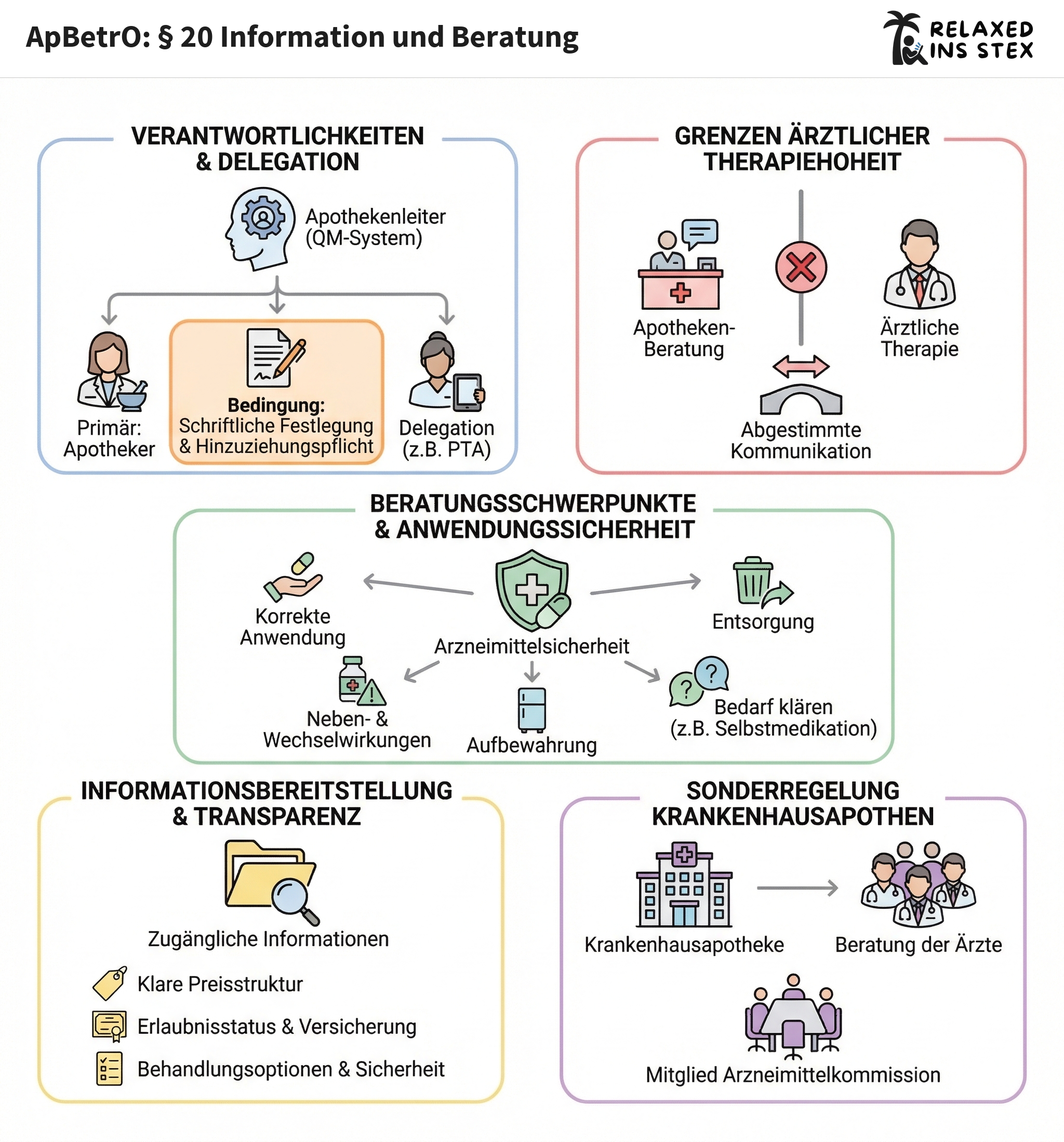 § 20 ApBetrO normiert detailliert, wie Informations- und Beratungspflichten in der Apotheke umgesetzt werden müssen. Die Verantwortung liegt beim Apothekenleiter, der die qualitative Umsetzung gewährleistet, Zuständigkeiten schriftlich festlegt und regelmäßig prüft. Im Mittelpunkt stehen die Sicherung der Anwendungssicherheit und die Unterstützung informierter Entscheidungen für Patient:innen und andere Kunden – immer unter Beachtung der ärztlichen Therapiehoheit.