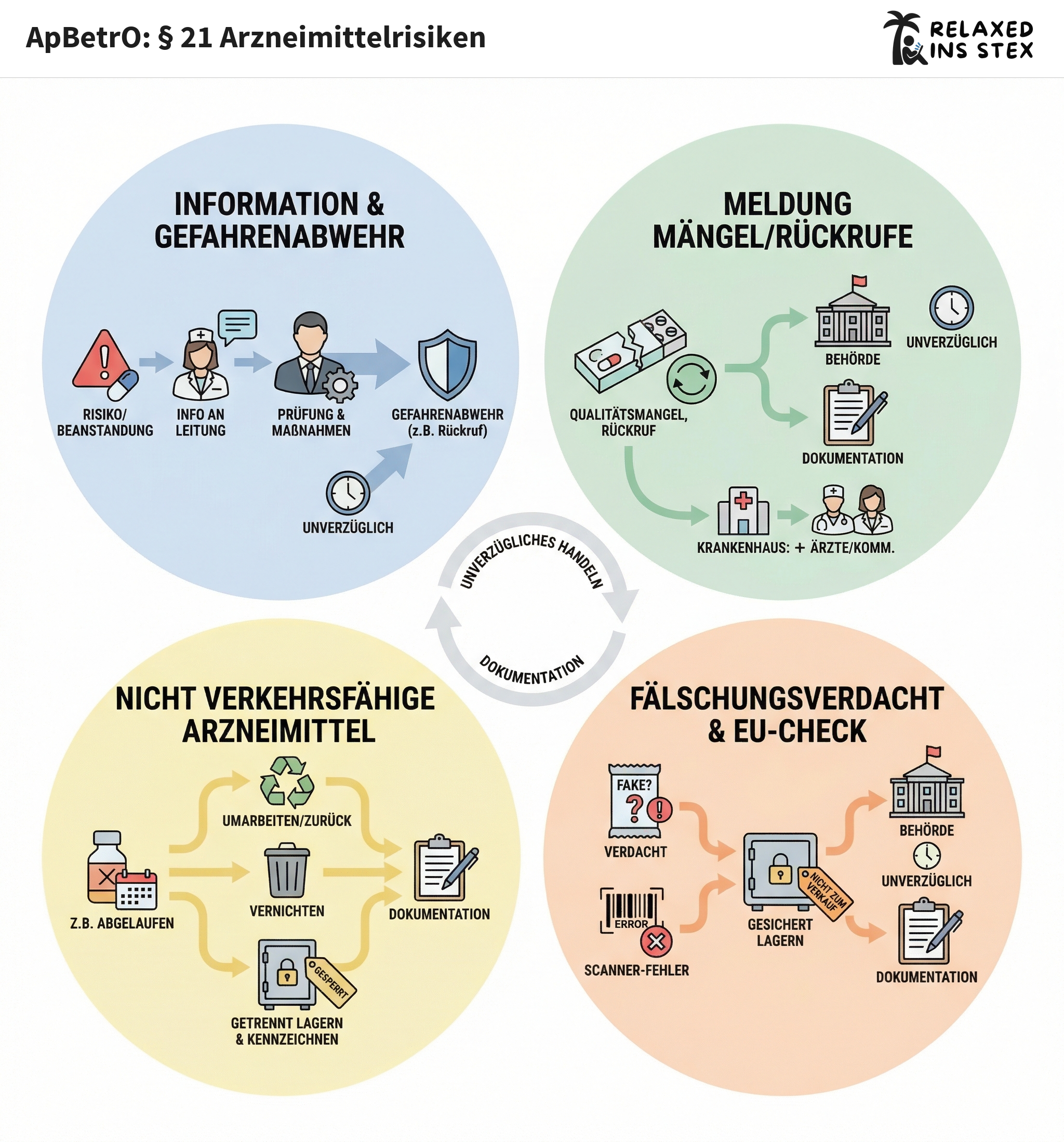 § 21 ApBetrO legt fest, wie in Apotheken beim Auftreten von Arzneimittelrisiken, bei Verdacht auf Qualitätsmängel und bei der Entdeckung (potenziell) gefälschter oder nicht verkehrsfähiger Arzneimittel vorzugehen ist. Zentral sind dabei die Pflichten zur unverzüglichen Meldung, zur sorgfältigen Dokumentation und zur sicheren Verwahrung verdächtiger Produkte.