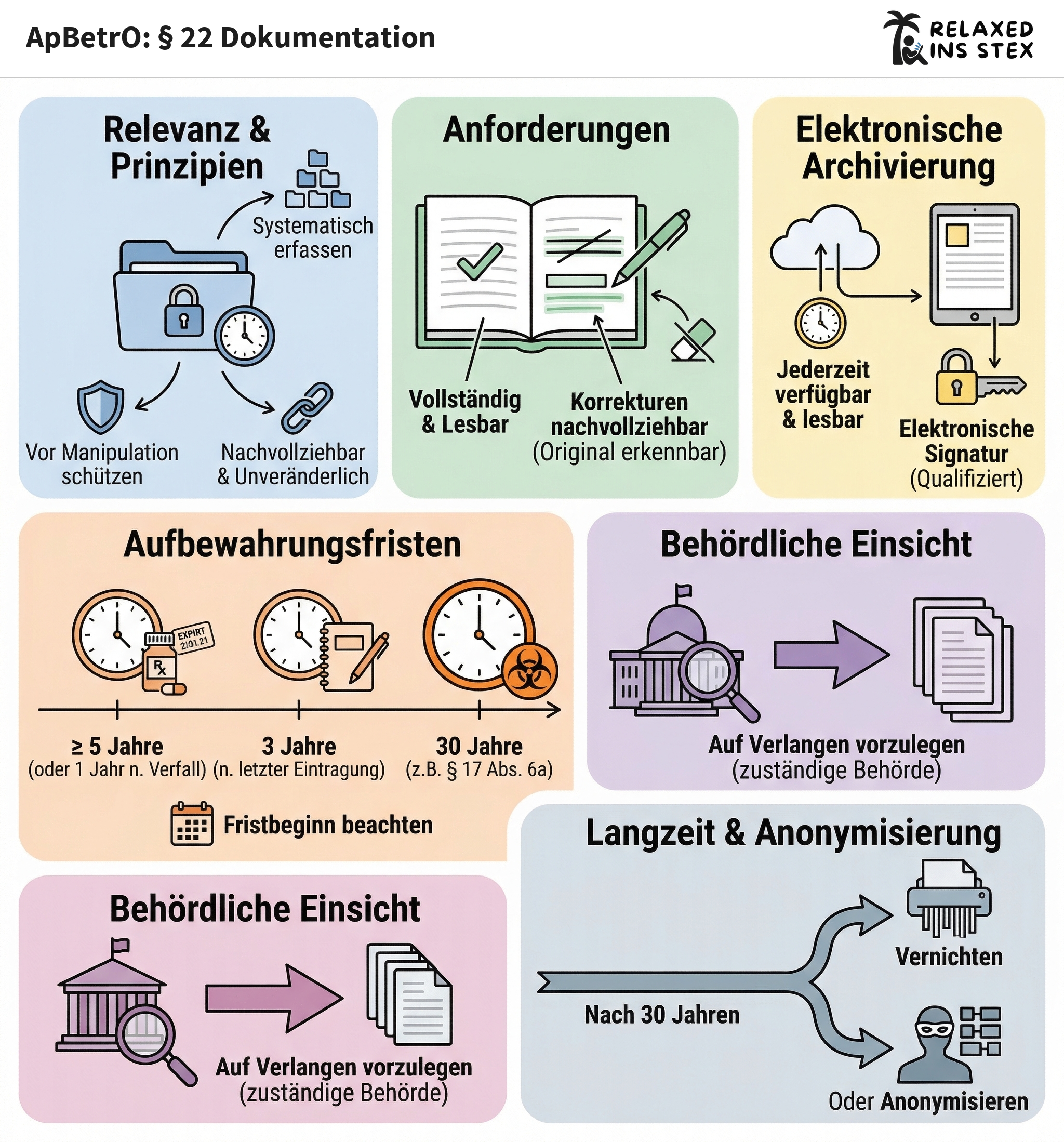 § 22 ApBetrO verpflichtet Apotheken zum nachhaltigen, unveränderlichen und nachvollziehbaren Führen und Archivieren aller zentralen Aufzeichnungen über Arzneimittelherstellung, -prüfung und -verkehr. Dabei sind spezifische Fristen strikt einzuhalten und die Lesbarkeit sowie Integrität der Dokumente – auch bei elektronischer Archivierung – sicherzustellen. Im Fall von Behördenanfragen müssen die Unterlagen jederzeit bereitgestellt werden können.