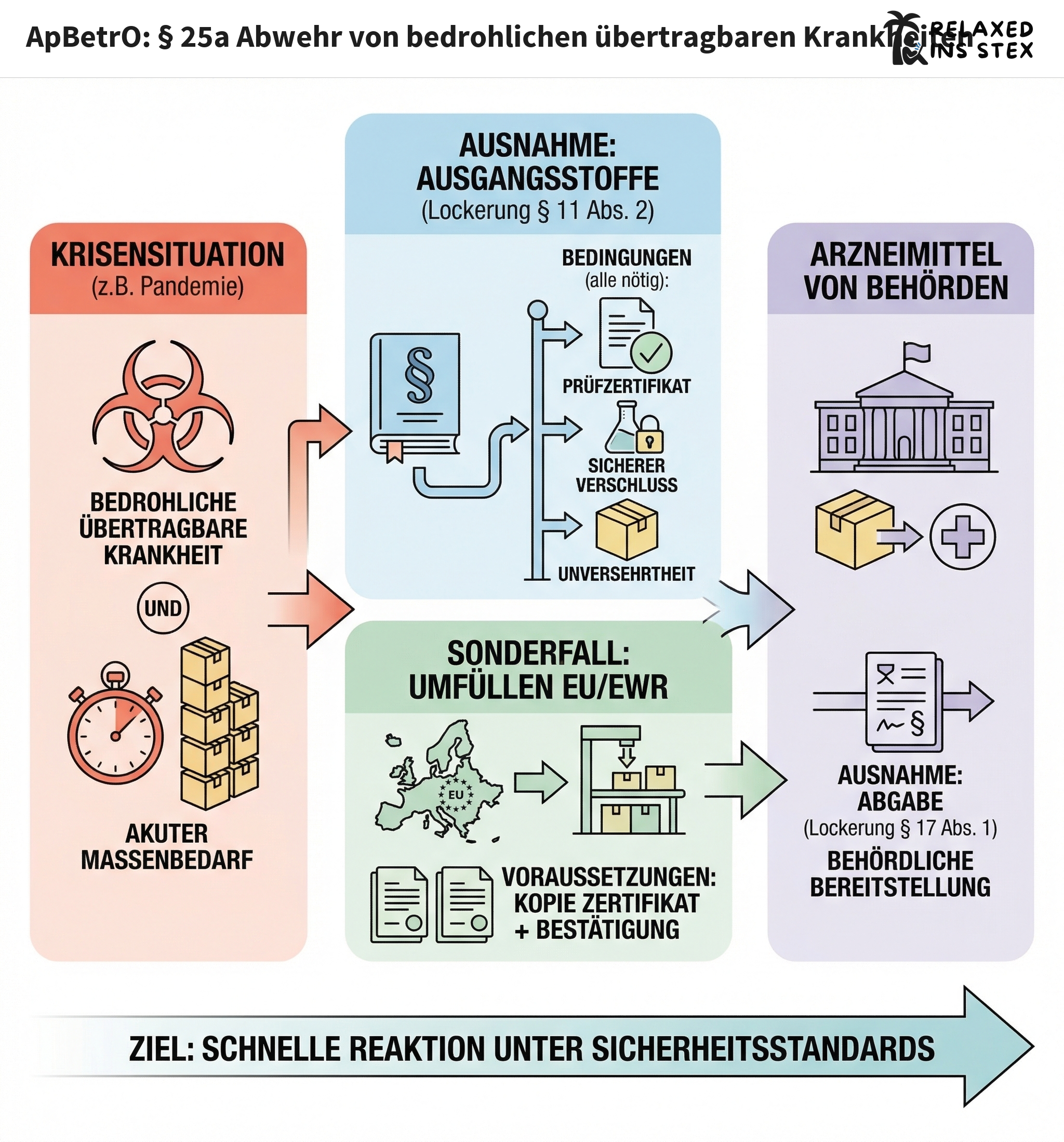 § 25a ApBetrO ermöglicht Apotheken, bei außergewöhnlichen Notfällen (z.B. einer Pandemie) ohne bürokratische Verzögerung schnell zu reagieren jedoch immer unter Einhaltung zentraler Sicherheitsstandards: Qualität, Unversehrtheit, nachvollziehbarer Verschluss & Dokumentation bleiben Pflicht!