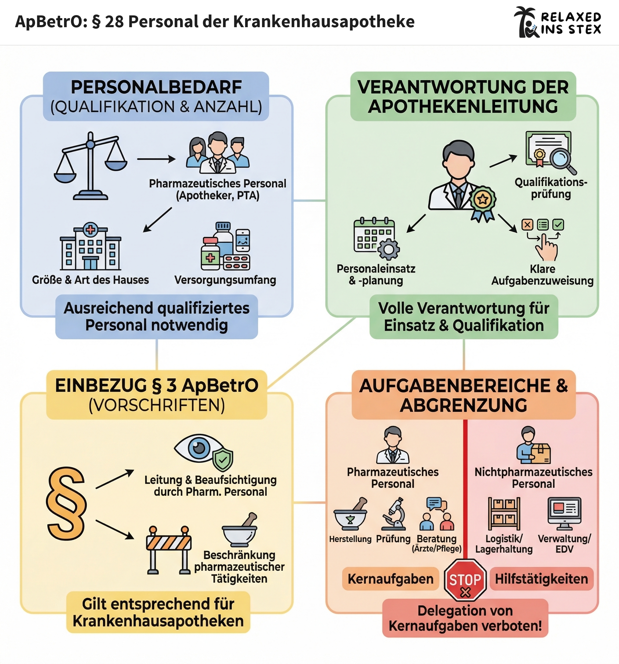 - Er*sie muss sicherstellen, dass Aufgabenbereiche klar abgegrenzt sind (z. B. keine Übertragung pharmazeutischer Tätigkeiten auf Hilfspersonal).