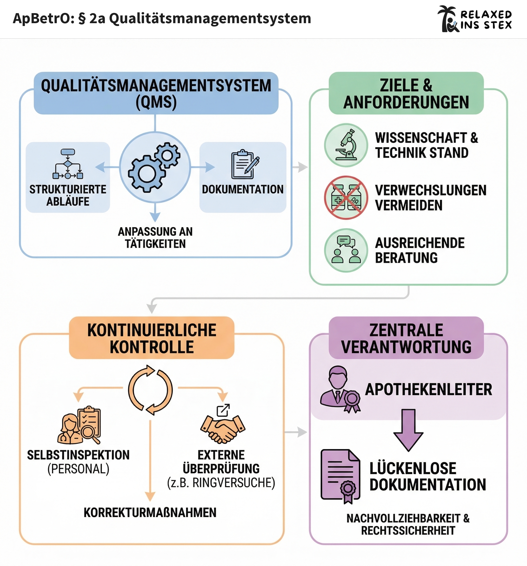 § 2a ApBetrO verlangt ein lebendiges Qualitätsmanagementsystem in jeder Apotheke. Festgelegte und klar dokumentierte Abläufe, regelmäßige Eigenkontrolle, Korrekturmaßnahmen und fortlaufende Dokumentation sichern die Qualität pharmazeutischer Tätigkeiten und sind unerlässliche Voraussetzung für eine verantwortungsvolle Apothekenleitung.