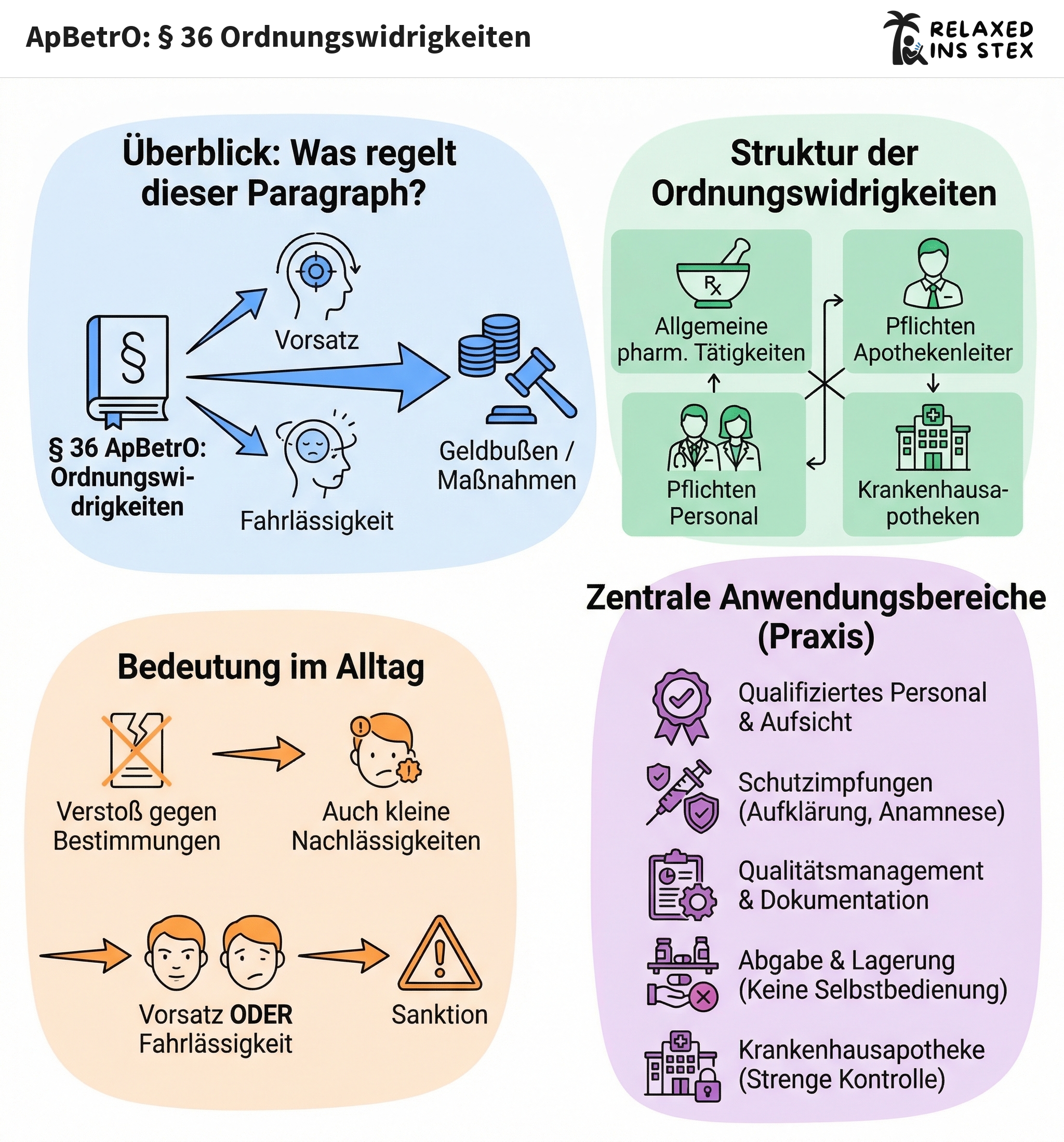§ 36 ApBetrO ist die zentrale Sanktionsvorschrift für Pflichtverstöße in der Apotheke. Der Paragraph gibt einen umfassenden Überblick darüber, welche Normverstöße als ordnungswidrig gelten, wer verantwortlich ist und in welchen Bereichen der Berufsalltag besonders aufmerksam gehandhabt werden muss. Die Kenntnis dieser Vorschrift ist essentiell, um typische Haftungsfallen zu meiden und die ordnungsgemäße Berufsausübung sicherzustellen.