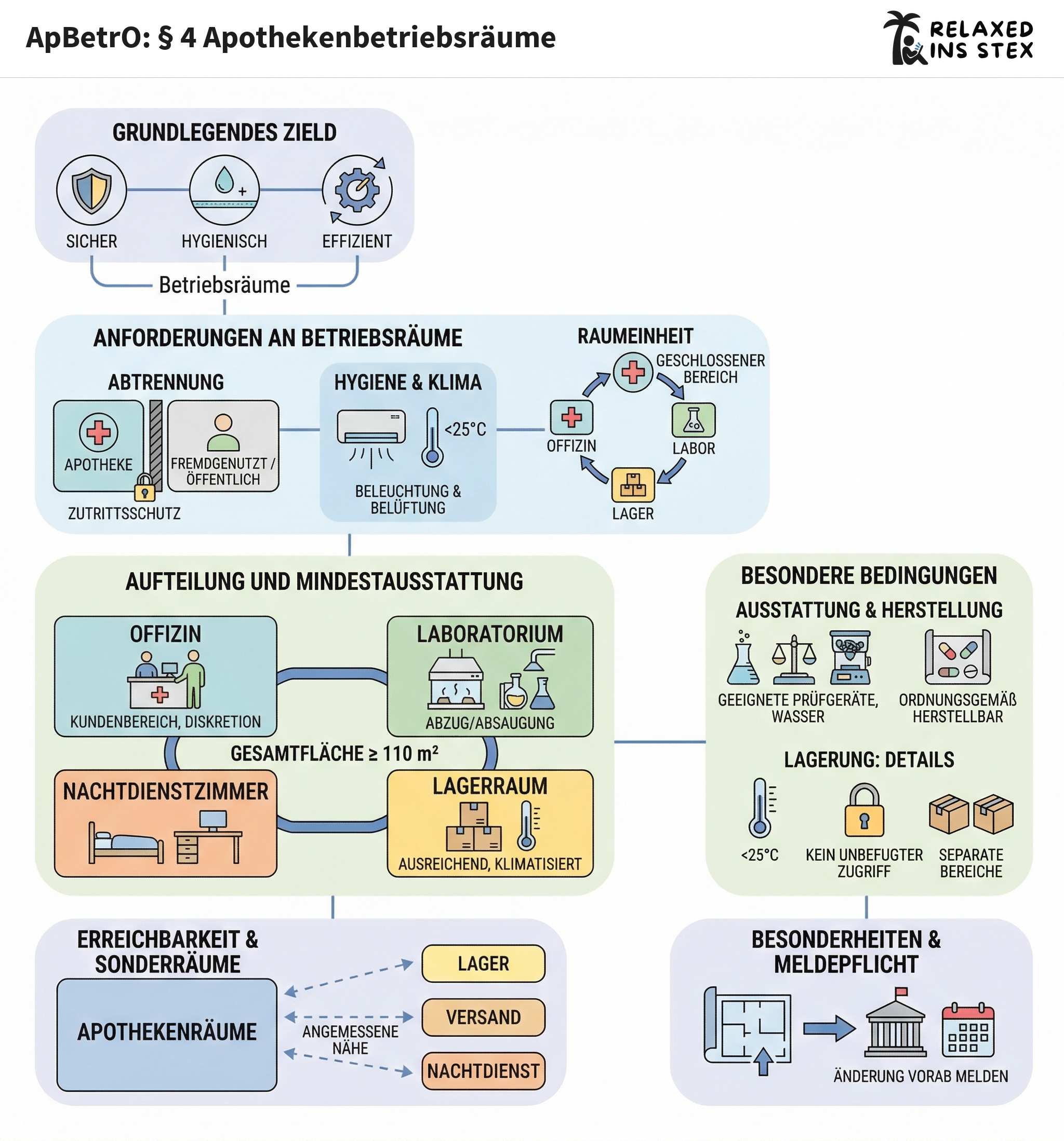 Die Betriebsräume müssen nach Art, Größe, Zahl, Lage und Einrichtung geeignet sein, einen ordnungsgemäßen Apothekenbetrieb […] zu gewährleisten.