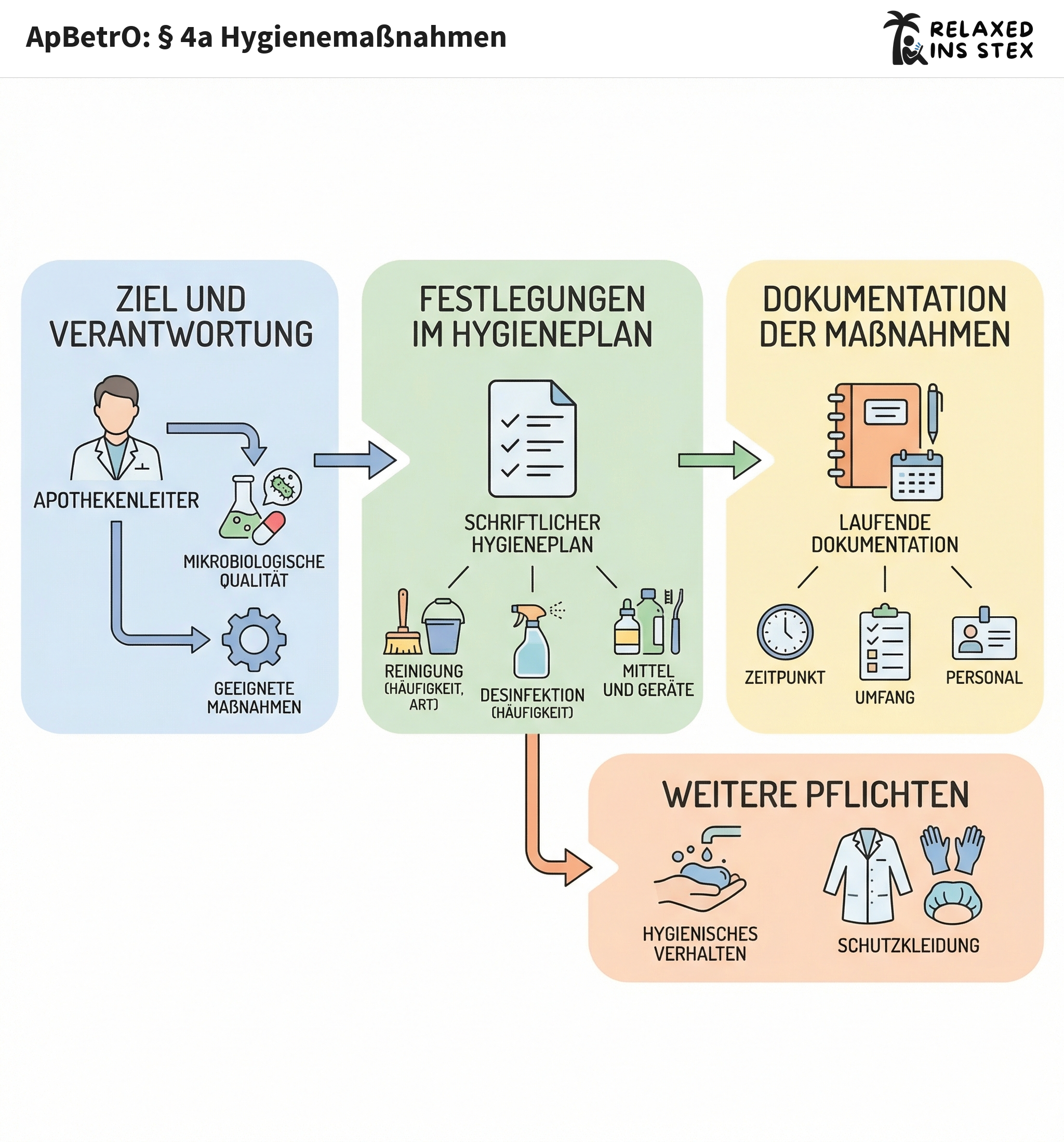 § 4a ApBetrO regelt, wie Apotheken die hygienische Qualität bei der Herstellung von Arzneimitteln sicherstellen müssen. Im Mittelpunkt steht dabei die Verantwortung des Apothekenleiters für Personal und Betriebsräume.