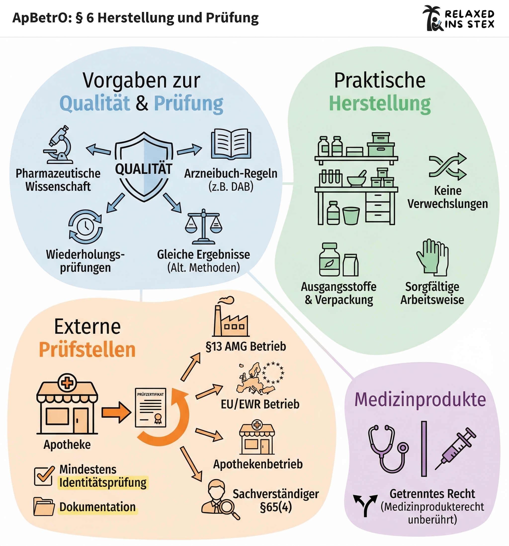 § 6 ApBetrO regelt die grundlegenden Qualitäts- und Prüfanforderungen für Arzneimittel, die innerhalb einer Apotheke hergestellt werden. Der Paragraph legt fest, wie die Herstellung und Prüfung erfolgen müssen, welche Standards anzuwenden sind und wann die Prüfung extern vergeben werden darf.