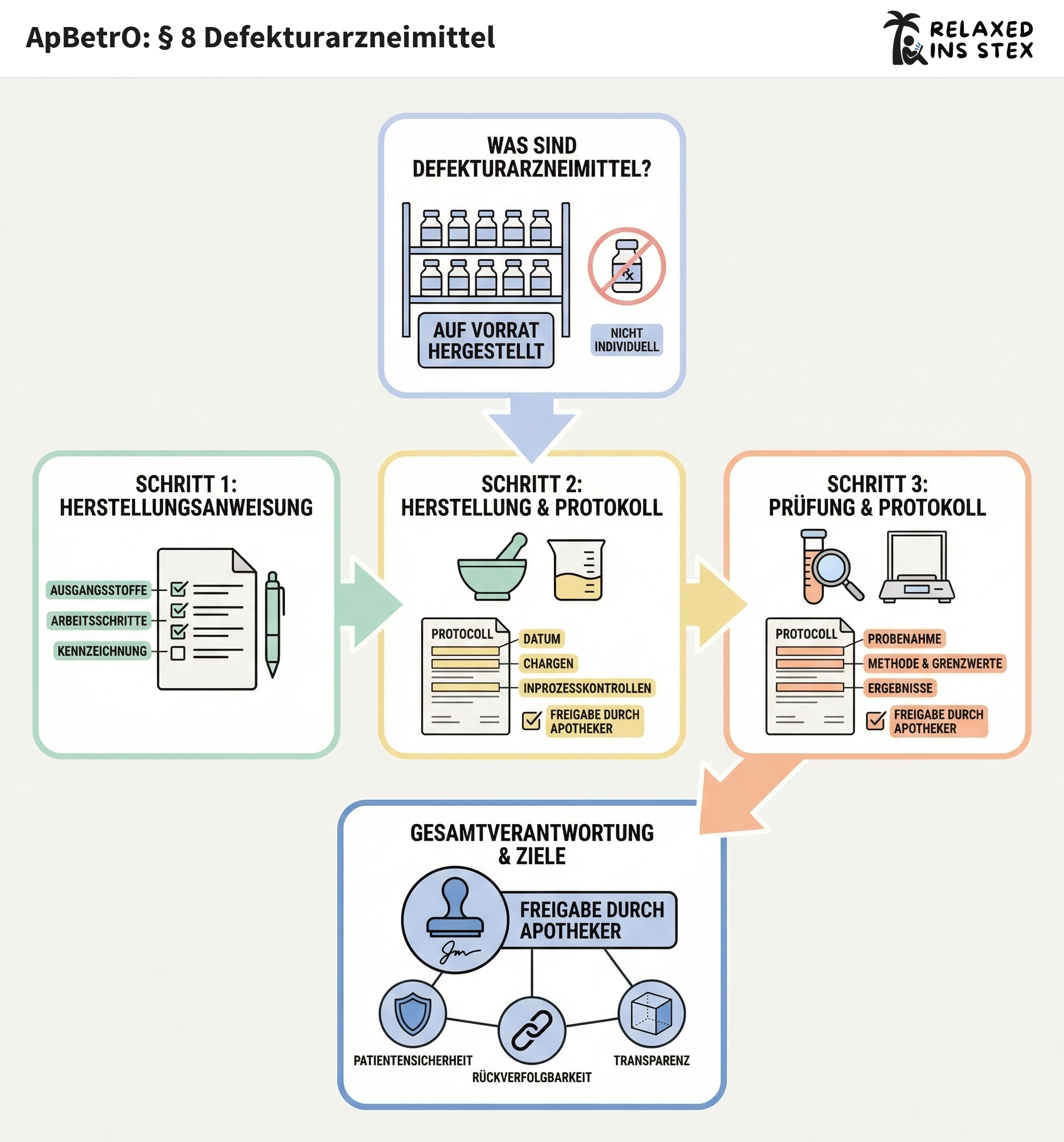 Dieser Paragraph regelt die systematische und nachvollziehbare Herstellung sowie Prüfung von Defekturarzneimitteln in der Apotheke. Er legt die Verantwortlichkeiten, den Ablauf und die Dokumentationspflichten fest, mit besonderem Blick auf die Freigabe durch den Apotheker.