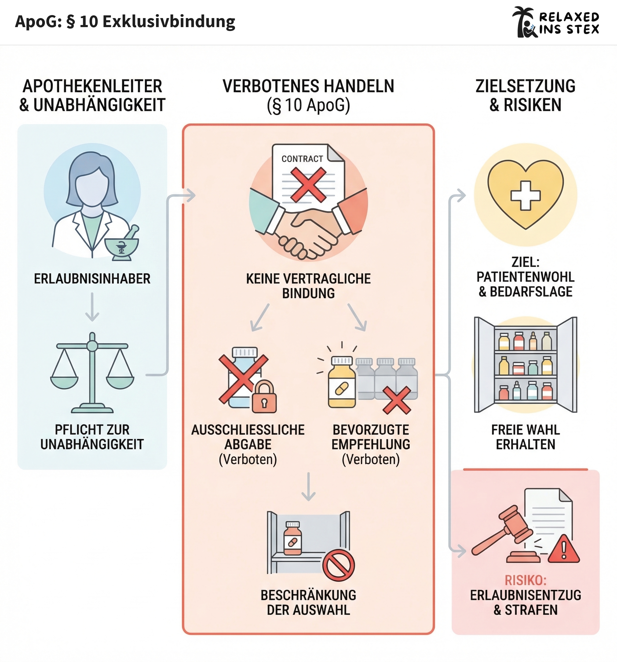 Der Paragraph schützt die Unabhängigkeit der Apotheke. Die Hauptsorge: Apotheken sollen nicht durch vertragliche Bindungen in ihrer Produktwahl eingeschränkt werden. Arzneimittelversorgung soll sich an der Bedarfslage und dem Patientenwohl orientieren – nicht an den Interessen von Herstellern oder Händlern.