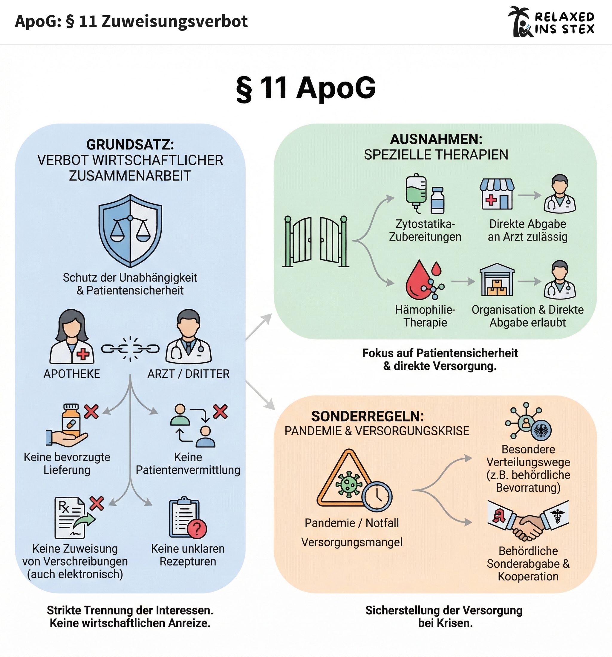 § 11 ApoG stellt das wirtschaftliche Trennungsgebot zwischen Apothekenbetrieb und anderen Heilberufen in den Mittelpunkt. Er enthält ein umfassendes Verbot wirtschaftlich motivierter Absprachen im Bereich der Arzneimittelversorgung und regelt zugleich wichtige Ausnahmen für Spezialfälle und Not- bzw. Pandemiesituationen, in denen Kooperationen zugunsten der Patientensicherheit ausdrücklich zulässig sind.