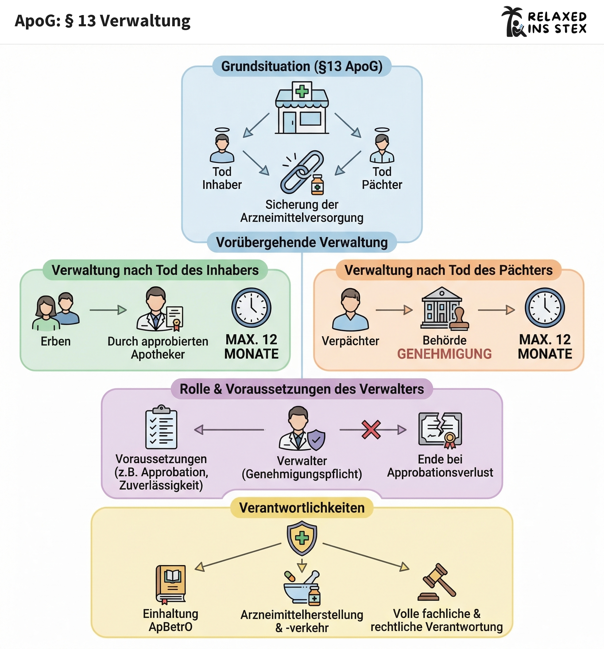 §13 ApoG ermöglicht eine begrenzte Übergangsverwaltung der Apotheke nach dem Tod des Inhabers oder Pächters, um Versorgungslücken zu vermeiden – jedoch stets unter strengen personellen und rechtlichen Vorgaben. Für die examensorientierte Praxis ist dabei das besondere Augenmerk auf die behördliche Genehmigung, die maximale Verwaltungsdauer sowie die uneingeschränkte Verantwortung und Eignung des Verwalters zu legen.