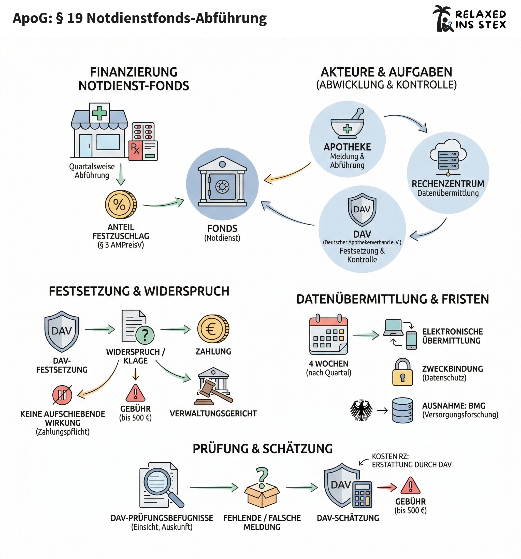 § 19 ApoG regelt transparent und lückenlos den Zahlungsfluss und die Kontrolle der sogenannten Notdienstzuschläge. Apotheken sind hier zu regelmäßigen Meldungen sowie zur pünktlichen Abführung verpflichtet. Der Deutsche Apothekerverband e. V. übernimmt dabei eine zentrale Kontroll- und Abwicklungsfunktion, mit klaren Rechten und Pflichten gegenüber allen Beteiligten. Die Einhaltung dieser Regeln ist essenziell für ein funktionierendes, solidarisch finanziertes Notdienstsystem.