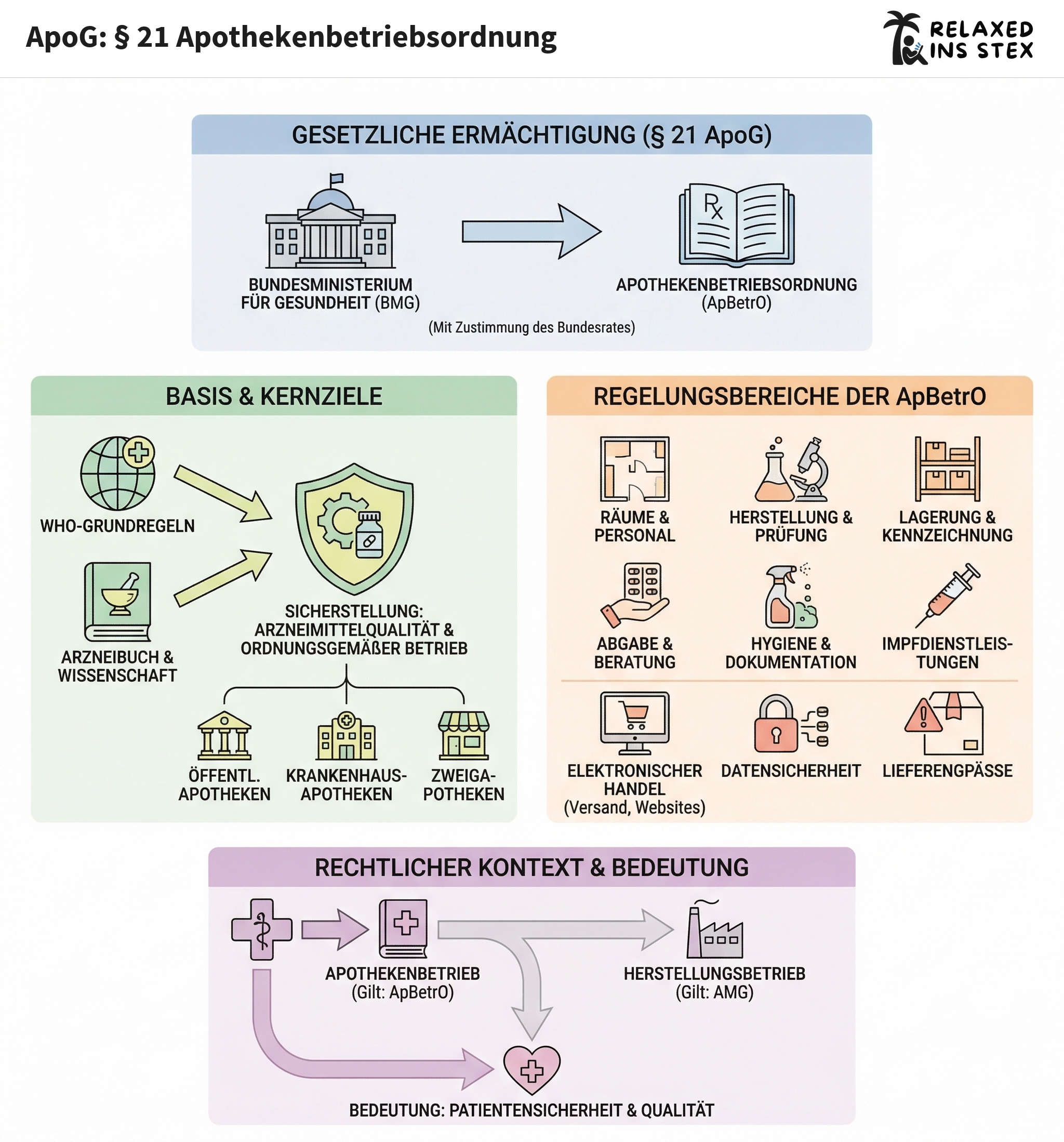 § 21 ApoG schafft die gesetzliche Basis für die zentrale Ausführungsverordnung: Die Apothekenbetriebsordnung. Sie regelt detailliert alle wesentlichen Aspekte der Apothekenführung, bindet internationale und wissenschaftliche Standards ein, sorgt für hohe Arzneimittelqualität, Verbraucherschutz und eine moderne, auch digitale Apothekenpraxis. Für Apothekenleiter wie künftige Apotheker:innen ist die Kenntnis dieser Ermächtigungsgrundlage und der daraus resultierenden Vorgaben unverzichtbare Berufspraxis.