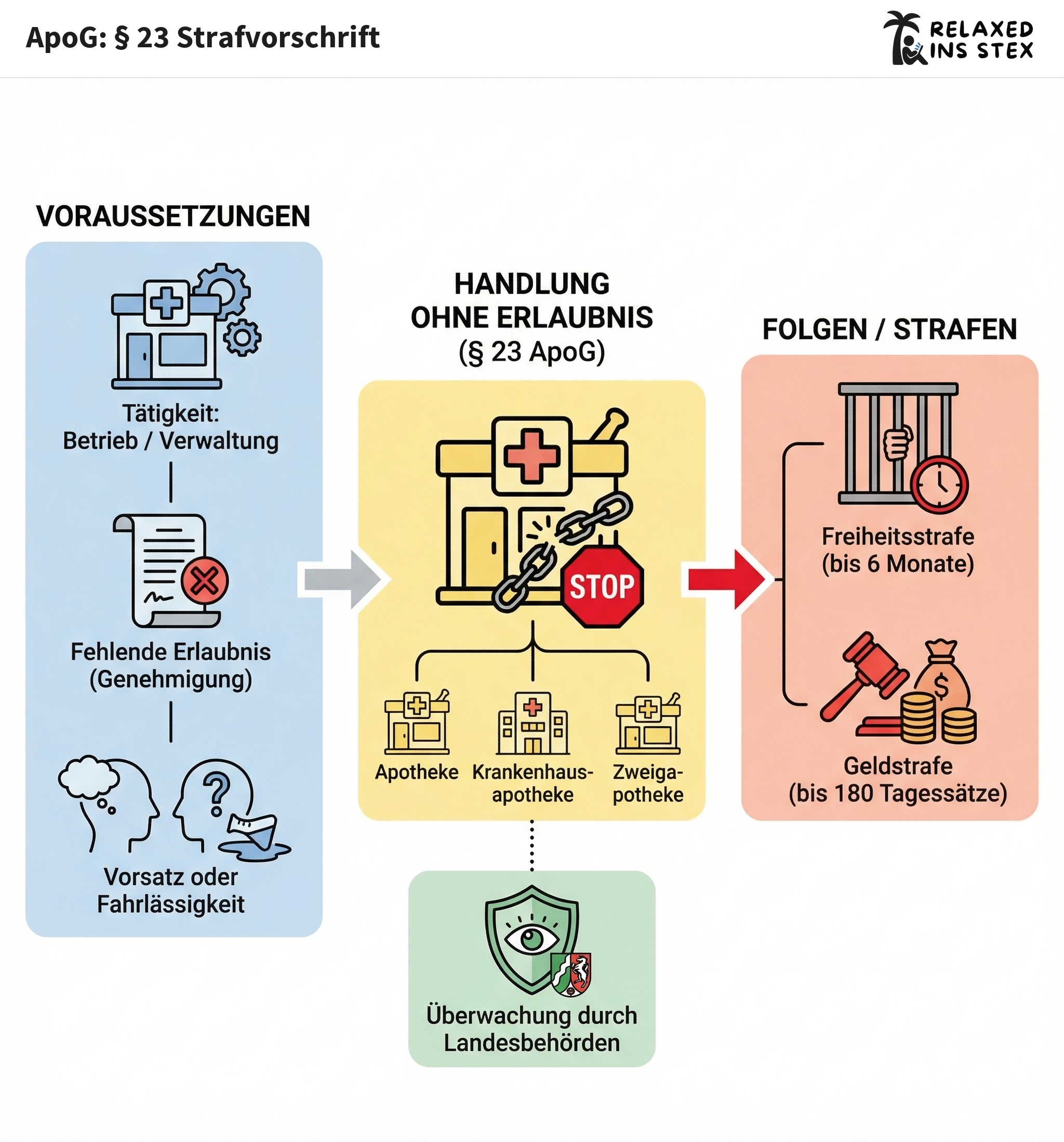 § 23 ApoG regelt, welche rechtlichen Konsequenzen drohen, wenn eine Apotheke, Krankenhausapotheke oder Zweigapotheke ohne die vorgeschriebene behördliche Erlaubnis betrieben oder verwaltet wird. Der Paragraph schafft so eine zentrale Absicherung für den Gesundheitsschutz und für die ordnungsgemäße Arzneimittelabgabe.