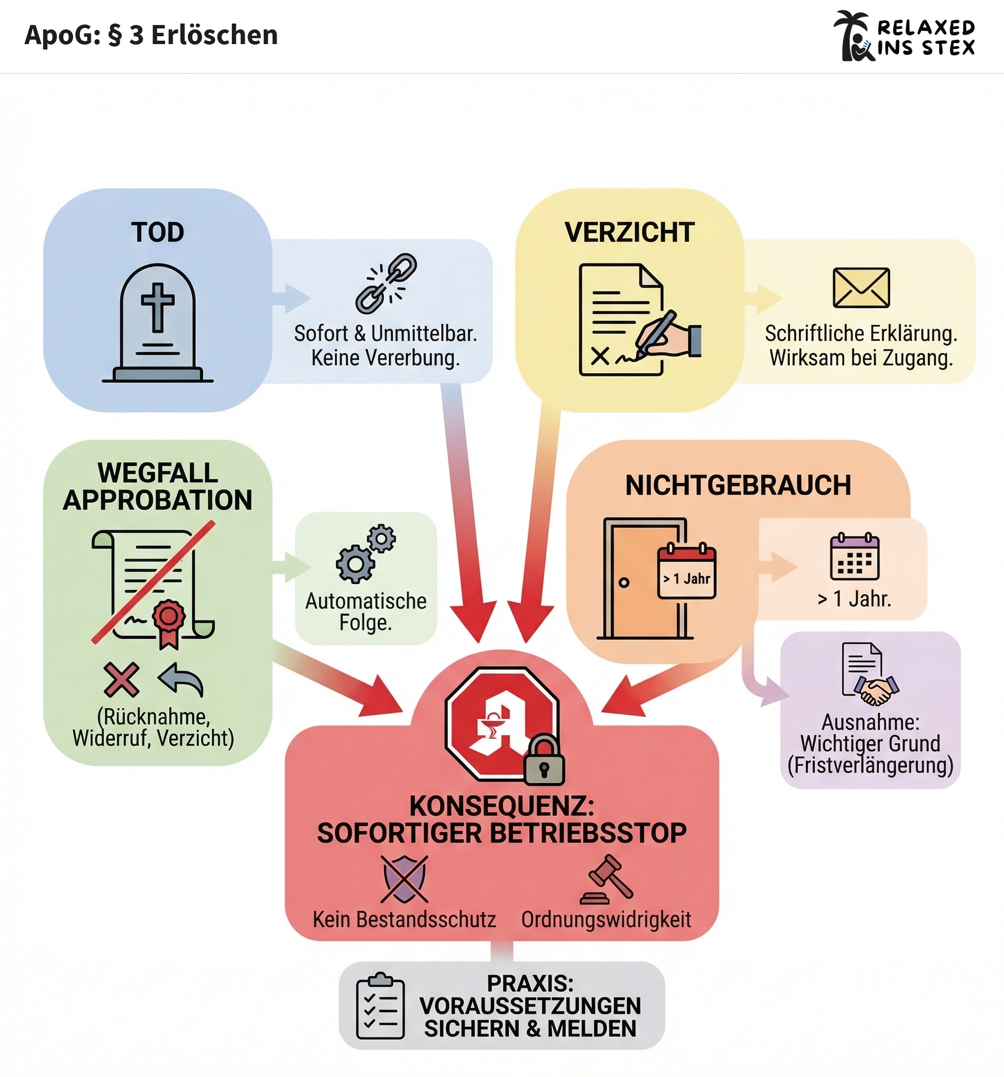 § 3 ApoG legt genau fest, unter welchen Bedingungen die Erlaubnis zum Betrieb einer Apotheke automatisch erlischt. Das ist für angehende Apotheker:innen besonders praxisrelevant, da der rechtssichere Betrieb der Apotheke unmittelbar daran geknüpft ist.