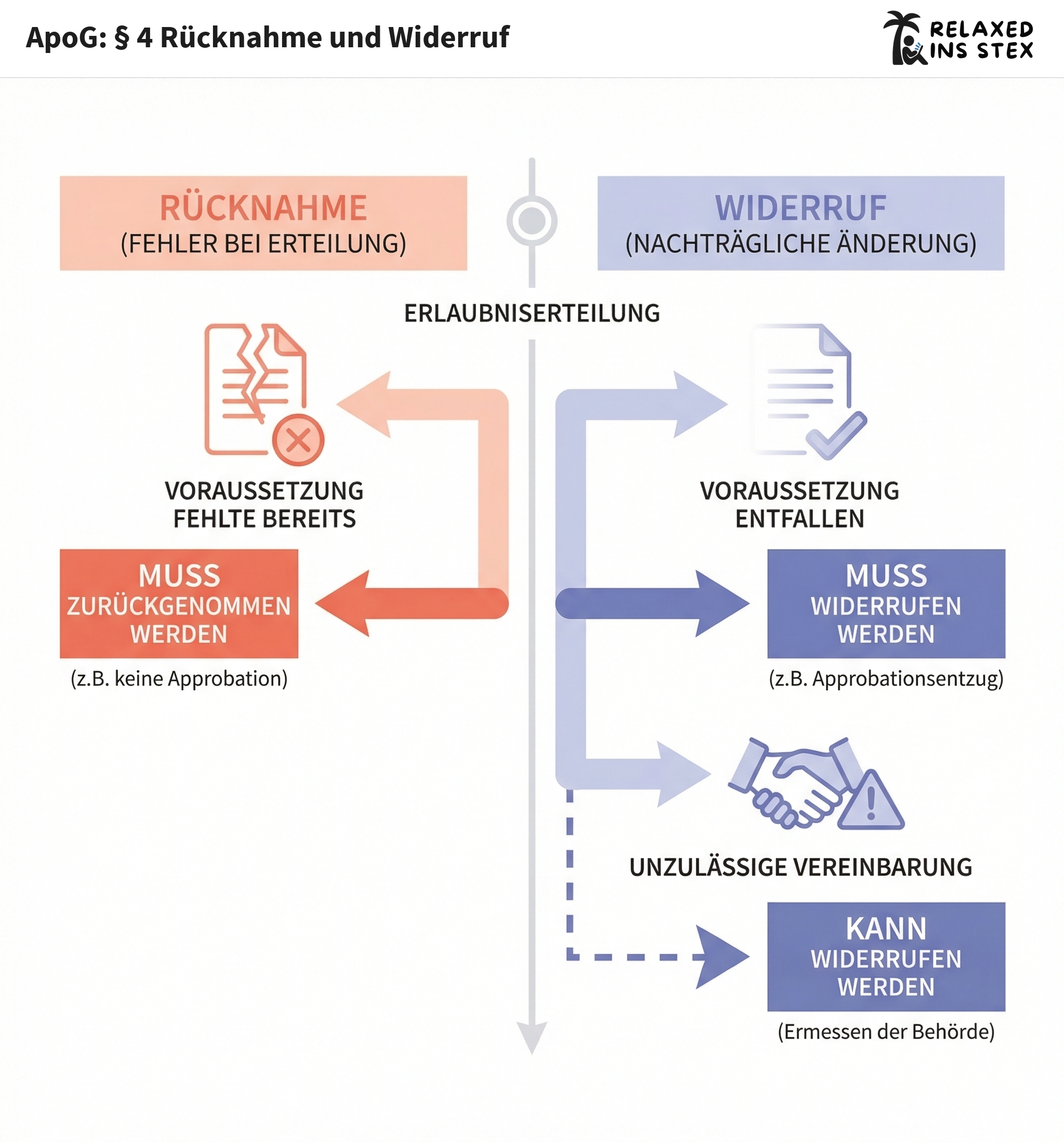 § 4 ApoG stellt sicher, dass Apotheken nur von Personen betrieben werden, die dauerhaft alle gesetzlichen Voraussetzungen erfüllen. Er deckt sowohl Fehler bei der Erlaubniserteilung (Rücknahme) als auch das Wegfallen von Voraussetzungen oder spätere Verstöße (Widerruf) ab. Besonders relevant ist das Wissen um die zwingenden und ermessensabhängigen Behördenhandeln – dies kann im Berufsalltag und im Examen entscheidend sein.