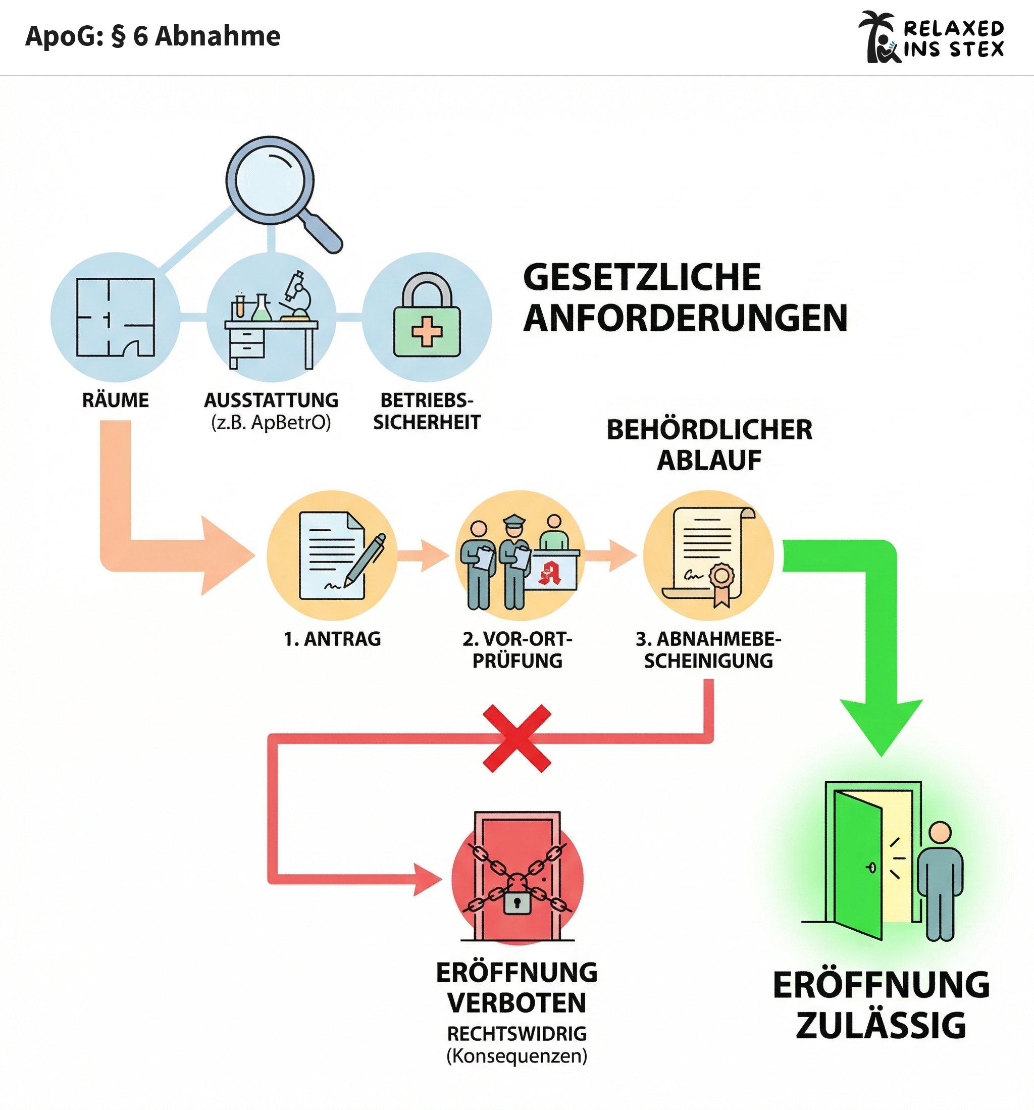 Für das Staatsexamen ist es essenziell, § 6 ApoG mit den Themen behördliche Kontrolle, Ablauf der Abnahme und Konsequenzen einer unerlaubten Eröffnung sicher zu verbinden. Im Berufsalltag ist die Einhaltung dieser Vorschrift Pflichtwissen für die rechtskonforme Apothekenleitung und -gründung.