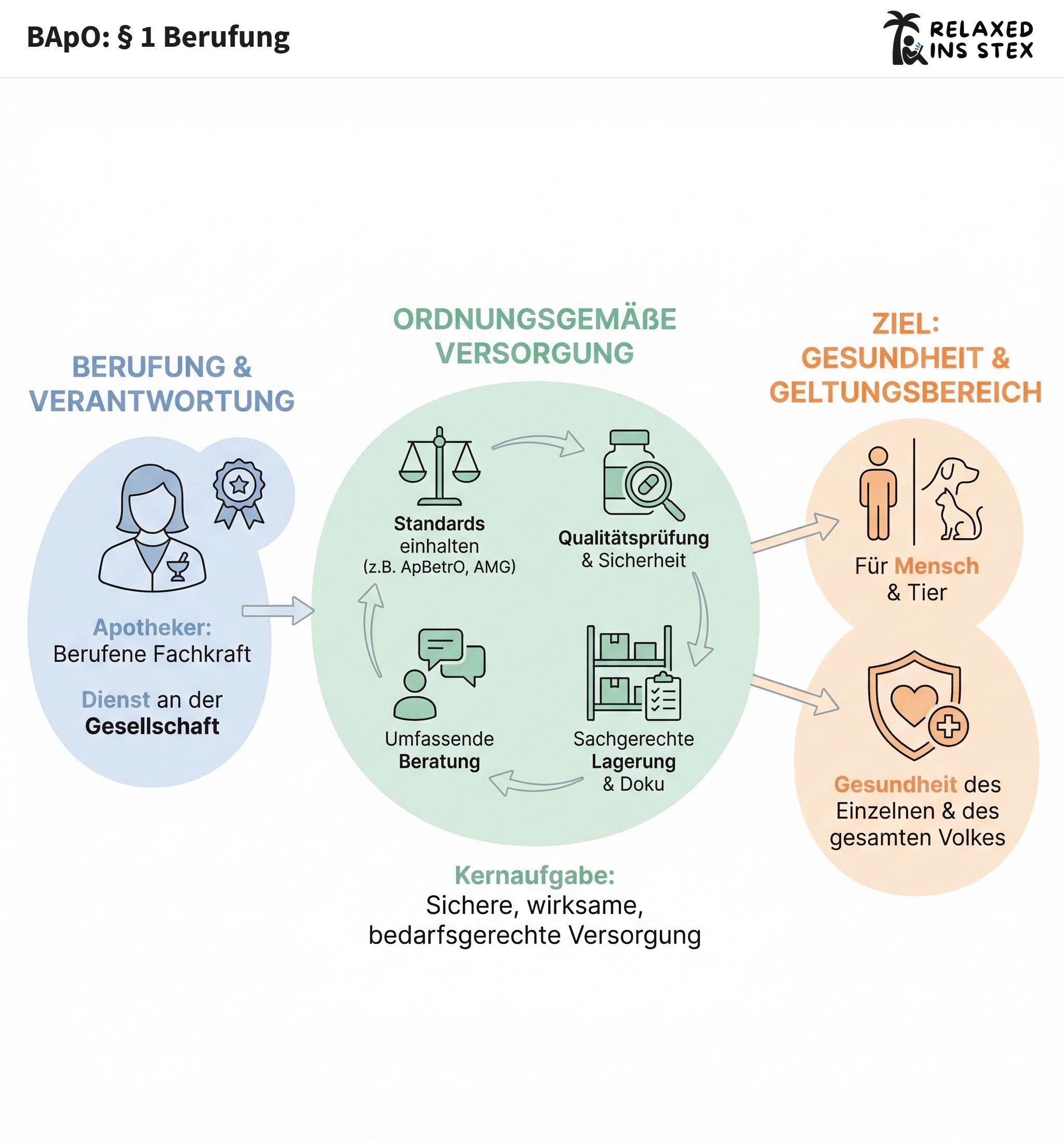 §1 BApO legt fest, dass Apotheker berufen sind, die Bevölkerung ordnungsgemäß mit Arzneimitteln zu versorgen – dazu zählen sowohl Mittel für den Menschen als auch Tierarzneimittel. Das zentrale Leitmotiv dieser Regelung ist die Gewährleistung der Gesundheit des Einzelnen und des gesamten Volkes.