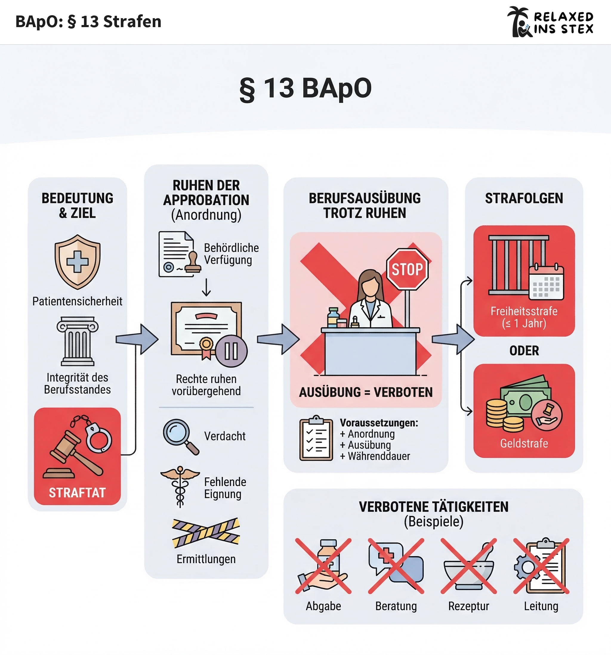 § 13 BApO stellt klar: Wer trotz einer angeordneten Ruhensanordnung der Approbation weiterarbeitet, begeht eine Straftat. Für Apotheker*innen ist es deshalb zwingend, bei erteiltem Ruhen der Approbation jegliche Berufsausübung sofort einzustellen und erst wieder nach erfolgter Aufhebung der Anordnung (z. B. nach Klärung der Vorwürfe) tätig zu werden.