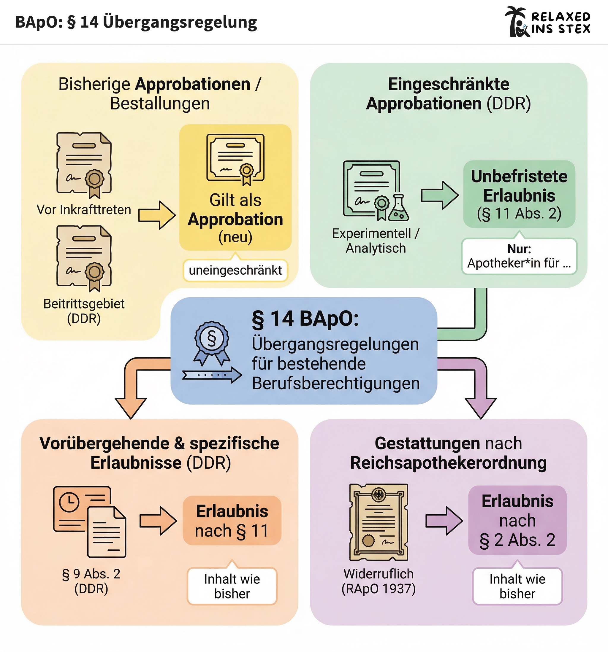 § 14 der Bundes-Apothekerordnung (BApO) regelt, welche älteren Berechtigungen zur Berufsausübung auch weiterhin als gültige Approbationen oder Erlaubnisse nach der neuen Rechtslage anerkannt werden. Dadurch werden Unsicherheiten für bereits Tätige vermieden und ein nahtloser Übergang zum aktuellen Recht gewährleistet.