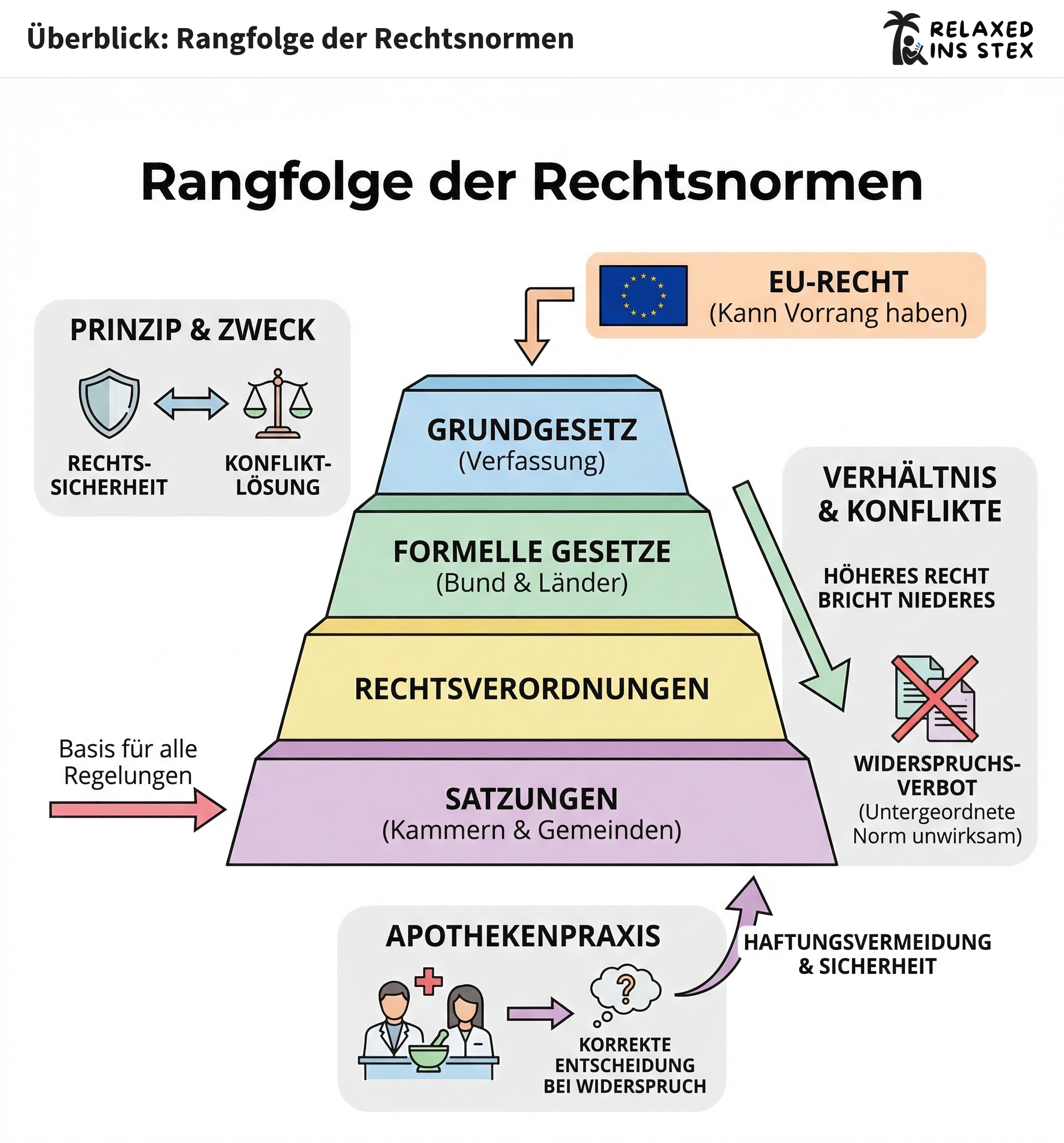 Das deutsche Rechtssystem ist wie eine Pyramide aufgebaut: Verschiedene Rechtsquellen stehen in einer festen Hierarchie zueinander. Diese Rangfolge sorgt dafür, dass Rechtssicherheit herrscht und Konflikte eindeutig gelöst werden können. Wer später als Apotheker:in arbeitet, muss wissen, welche Vorschriften warum und mit welcher Bindungskraft gelten – gerade, um Haftungsrisiken zu vermeiden, Arbeitsabläufe korrekt umzusetzen und im Zweifel richtig argumentieren zu können.